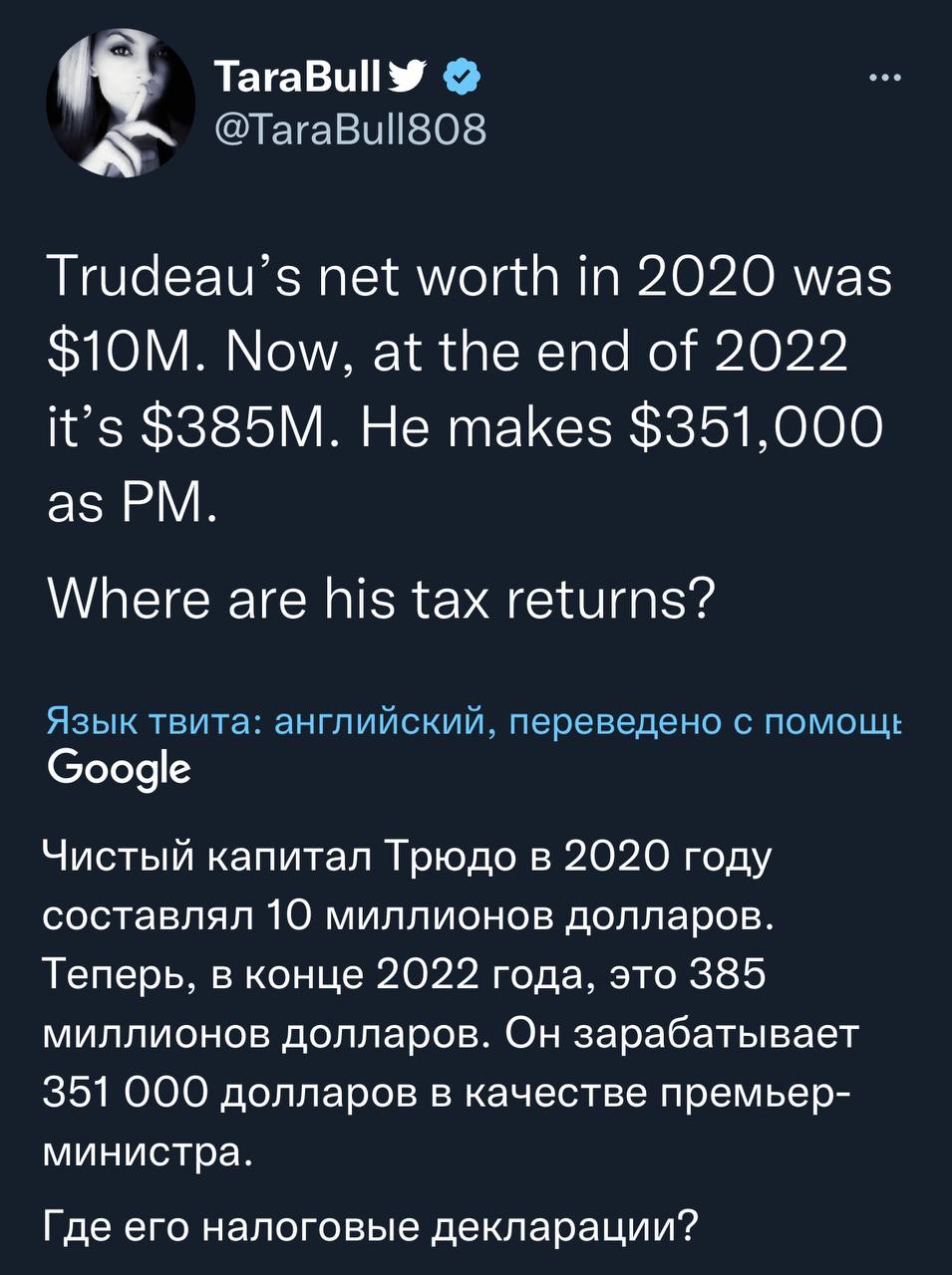 Товарищ Трюдо за 2 года получил 375 миллионов долларов дохода при официальной зарплате 351 тысяча долларов.