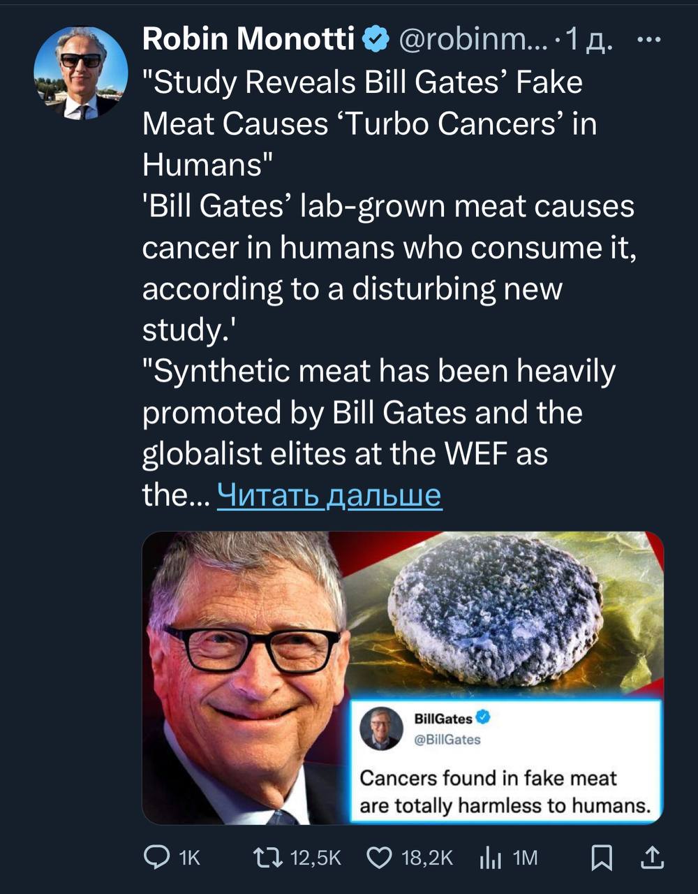 «Исследование показывает, что искусственное мясо Билла Гейтса вызывает у людей «турбо-рак».