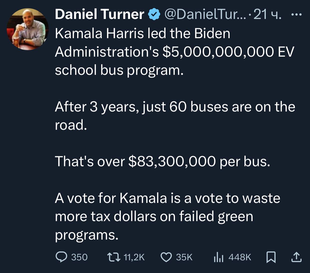 Камала Харрис руководила программой школьных электробусов администрации Байдена стоимостью 5 миллиардов долларов.