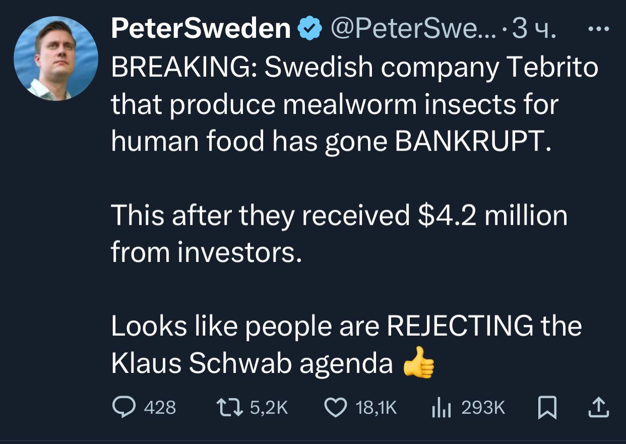 Шведская компания Tebrito, производящая мучных червей для употребления в пищу людям, обанкротилась.