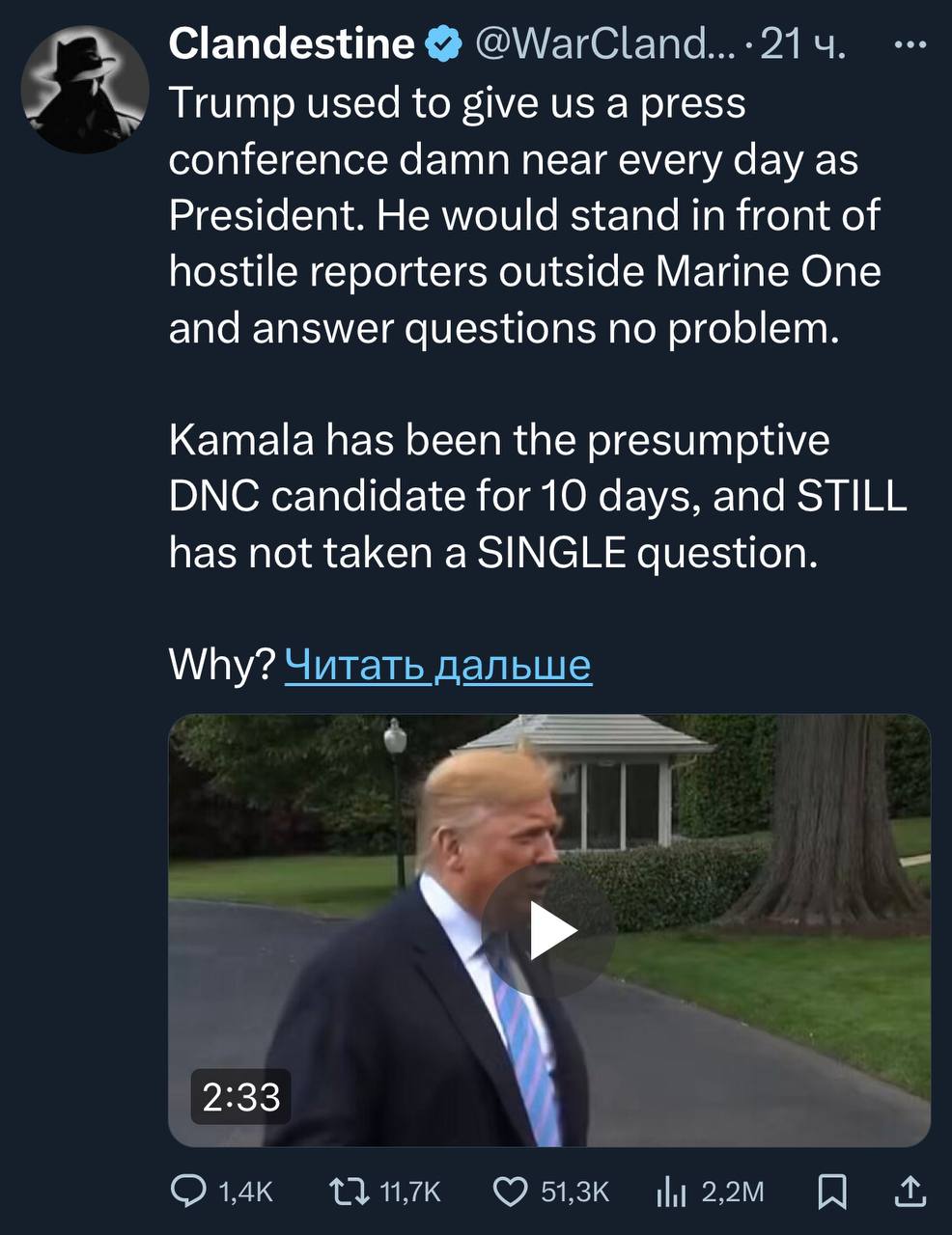 Камала была предполагаемым кандидатом от Демократической партии в течение 10 дней и ЕЩЕ не ответила ни на один вопрос.