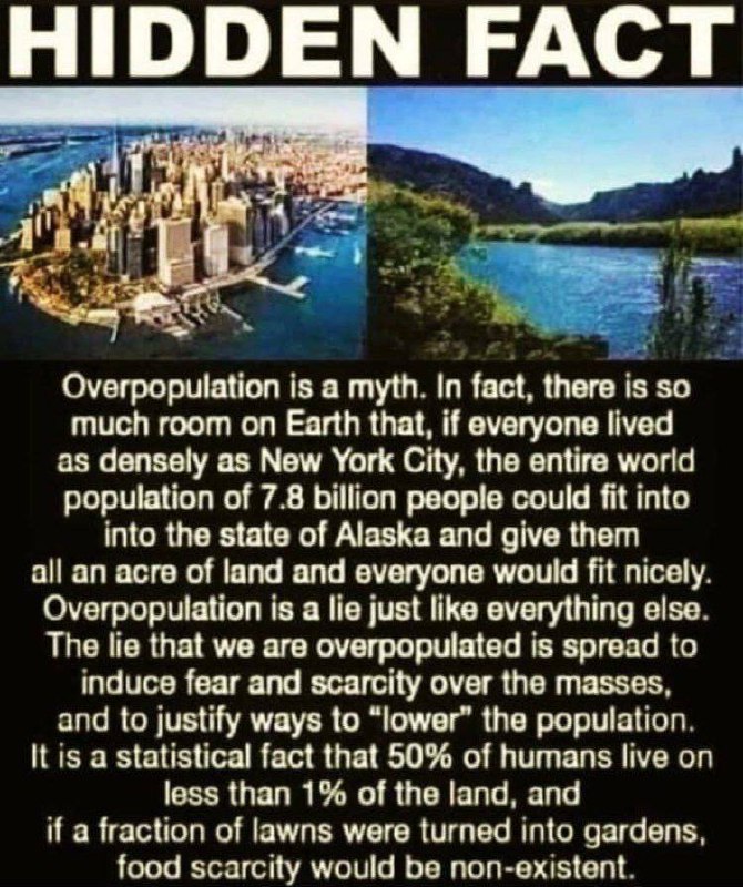 Ложь о том, что Земля перенаселена распространяется, чтобы вызвать страх и оправдать способы «уменьшить» население. Статистическим фактом является то, что 50% людей живут менее чем на 1% поверхности Земли.