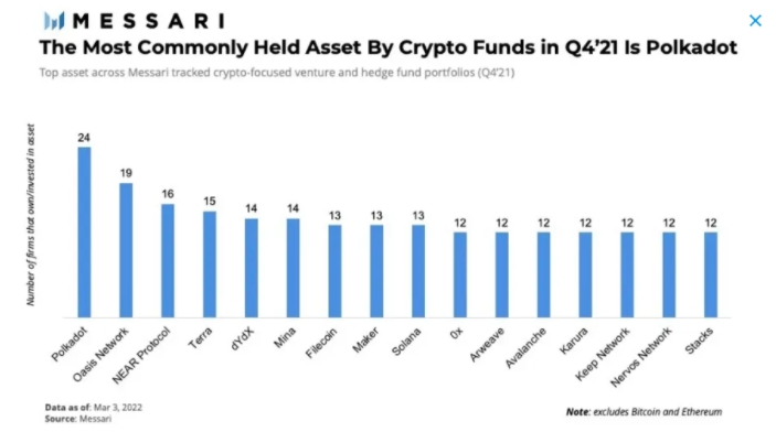 👀 Команда Messari провела анализ портфелей 50+ фондов. Установлено, что наиболее популярной монетой снова является Polkadot (DOT). Данную монету держит 42% фондов (24 из 57). Это может быть обусловлено в том числе и тем, что для участия в аукционах парачейнов на польке нужен нативный токен, поэтому многие фонды, делающие ставку на развитие экосистемы, держат DOT.
