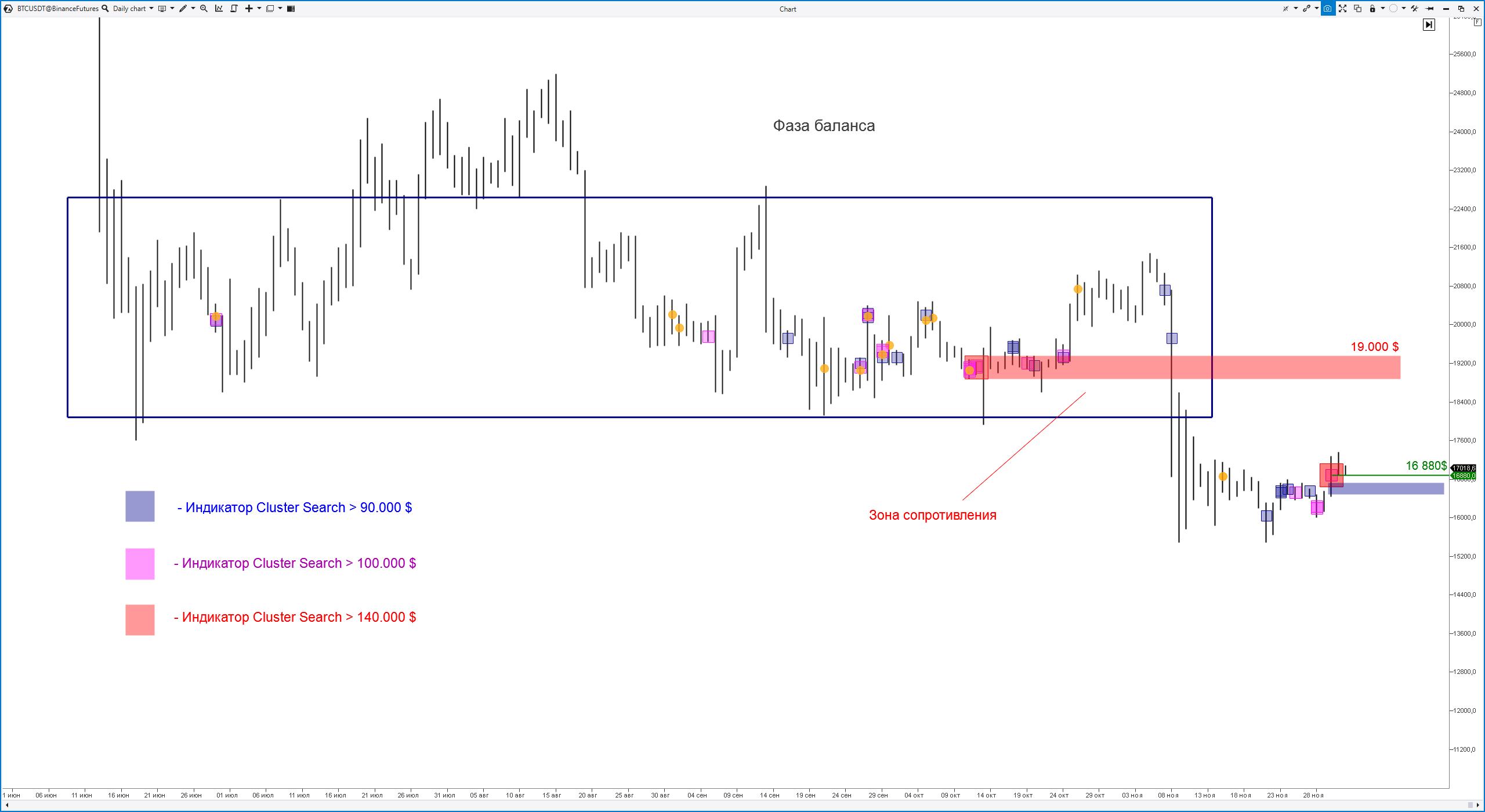 Информацию об этом мы можем получить из биржевой ленты принтов (T&S), которая отображает все совершенные сделки. После снижения к $15 480 и начиная с 23 ноября видим появление крупных сделок на $90 000 - $100 000 по одной цене, что указывает на активность крупных участников рынка.