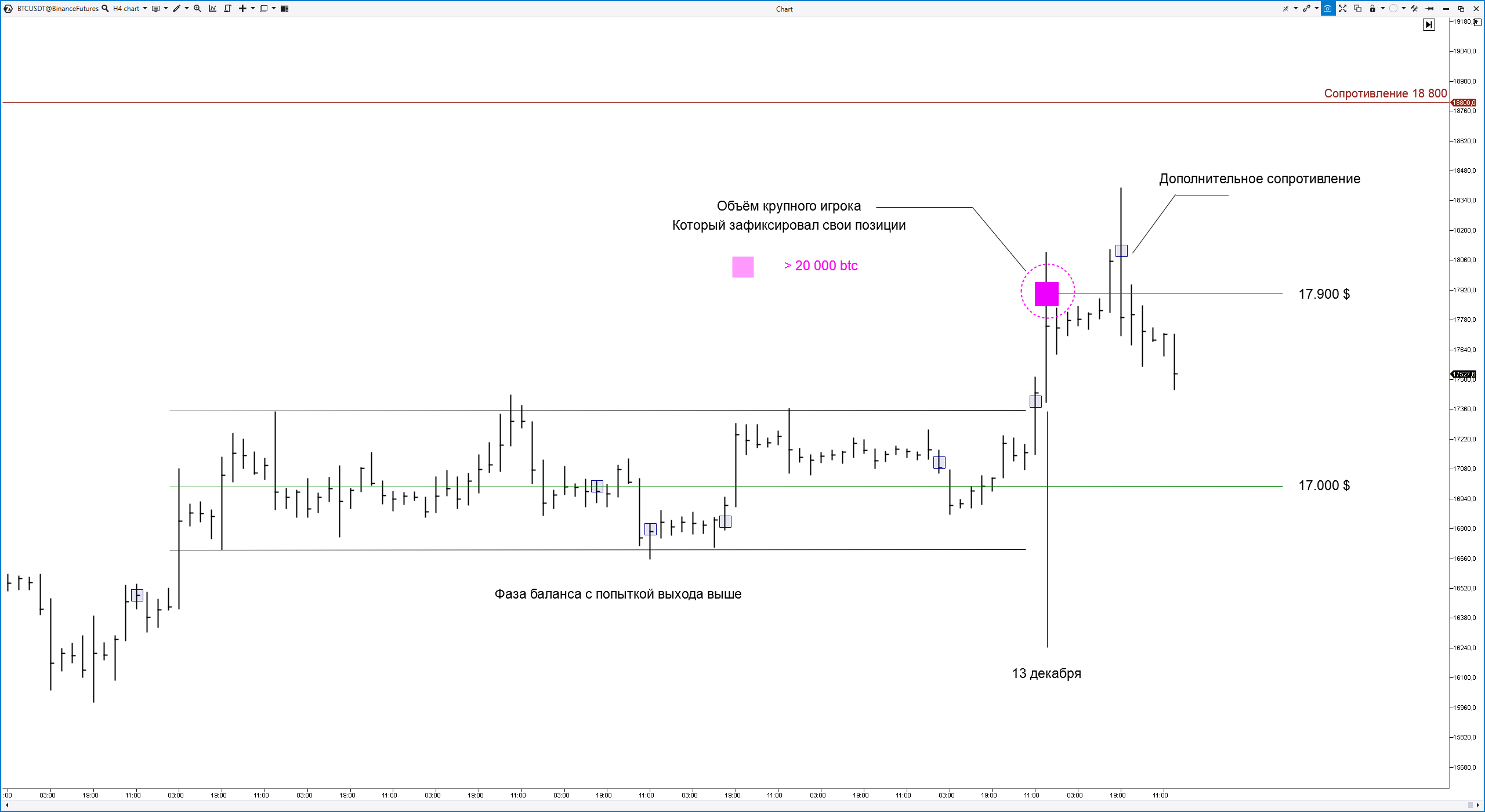 Еще 13 декабря на отметке $17 900 у нас проскочил аномальный объем. Последний раз такие аномалии можно было наблюдать в октябре. Учитывая то, что цена пытается развивать трендовое движение – это очень плохой признак. Значит крупный капитал начал фиксировать ранее набранный лонг. Сейчас цена биткоина находимся ниже объемов $17 900, что указывает на приоритет продаж в ближайшей перспективе.