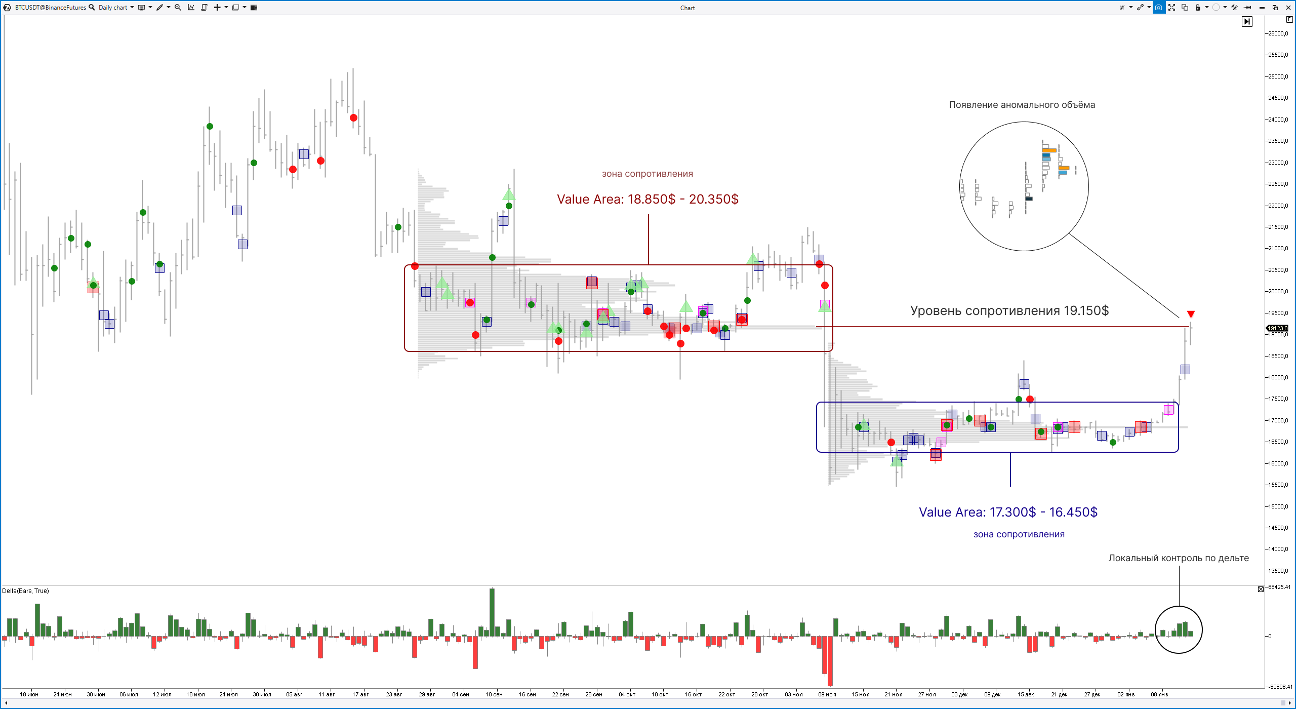 В случае, если в ближайшие дни у $19 150 продолжит появляться аномальное количество объема, которое направит котировку вниз – рост на январь можно будет считать завершенным, фиксировать прибыль по лонгам и открывать short с первичной целью до $17 300 (ближайший уровень поддержки).