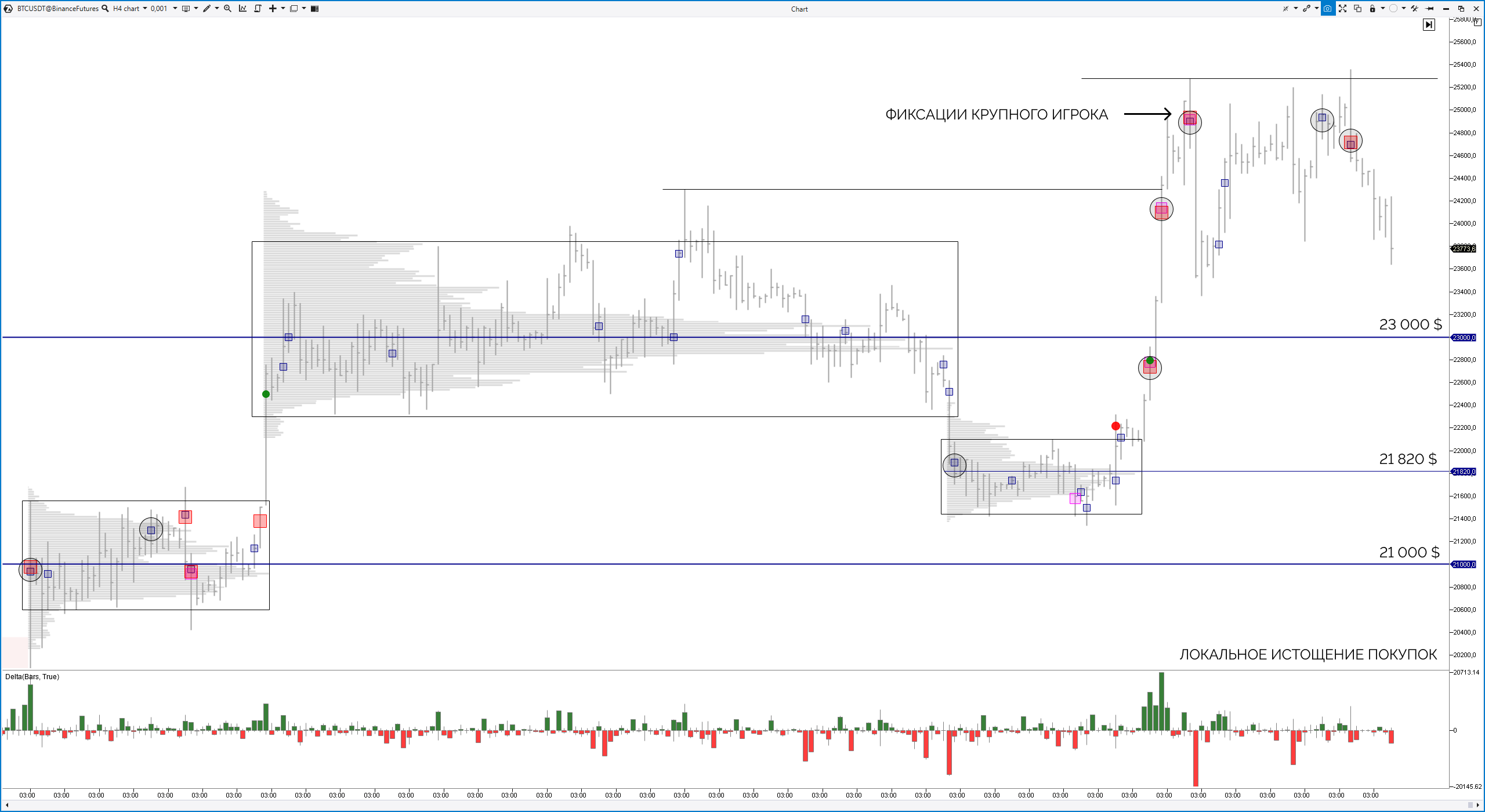 Ключевыми уровнями спроса, на которых проявит себя крупный покупатель, станут $23 000 и $21 000. Это уровни, выстроенные по горизонтальному распределению объемов, указывающему зоны интереса информированного участника рынка. Именно на этих отметках прошло большое количество торгов, и участники рынка будут вновь реагировать на выделенные цены.