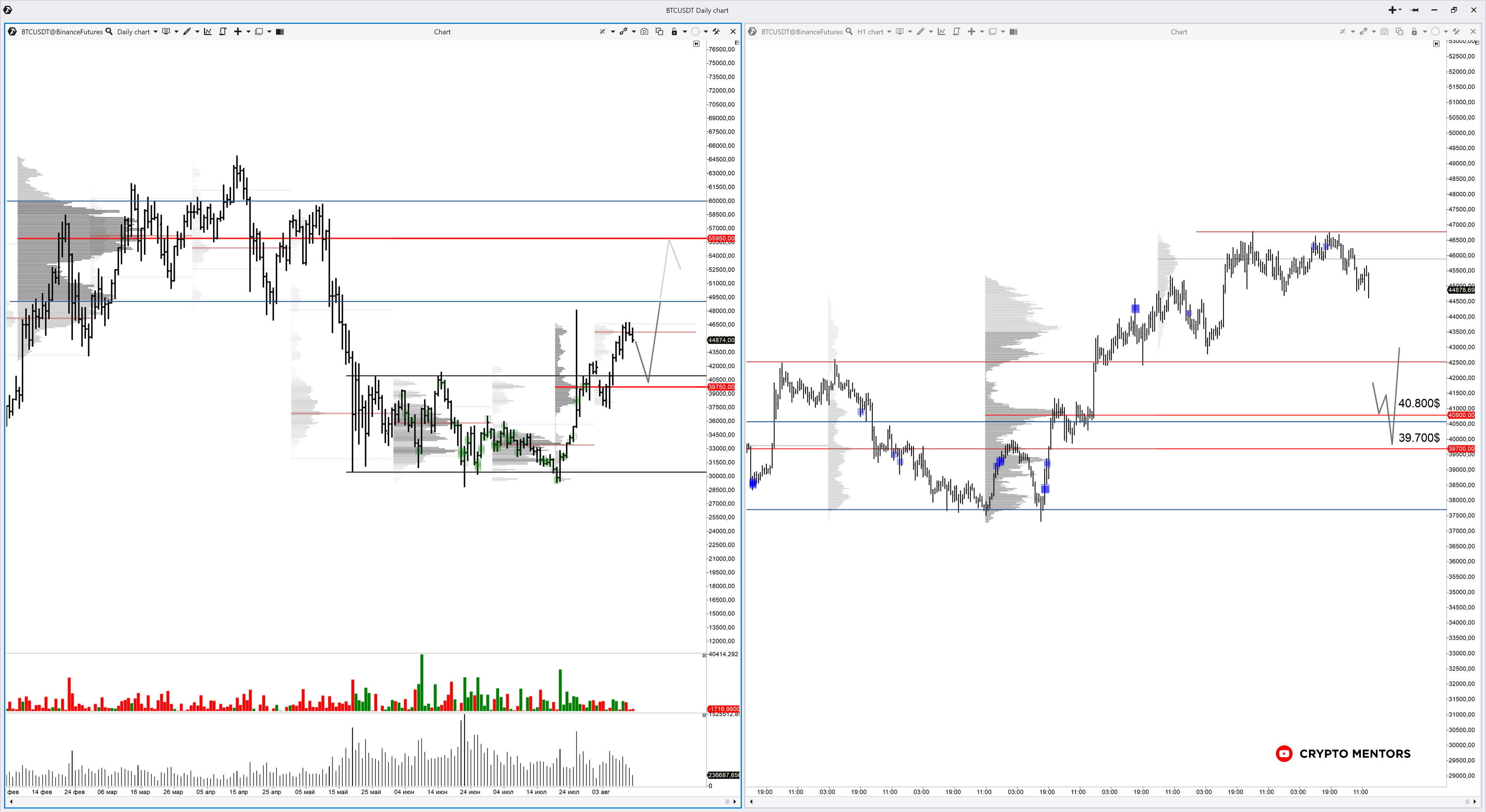 ▫️ В связи с тем, что локально мы можем наблюдать закругление по Price Action, дивергенцию по кумулятивной дельте, а также перенос максимального объема на хаи, логичнее всего сейчас было бы ожидать коррекцию к уровням $41.500, $40.800 или даже к $38.250