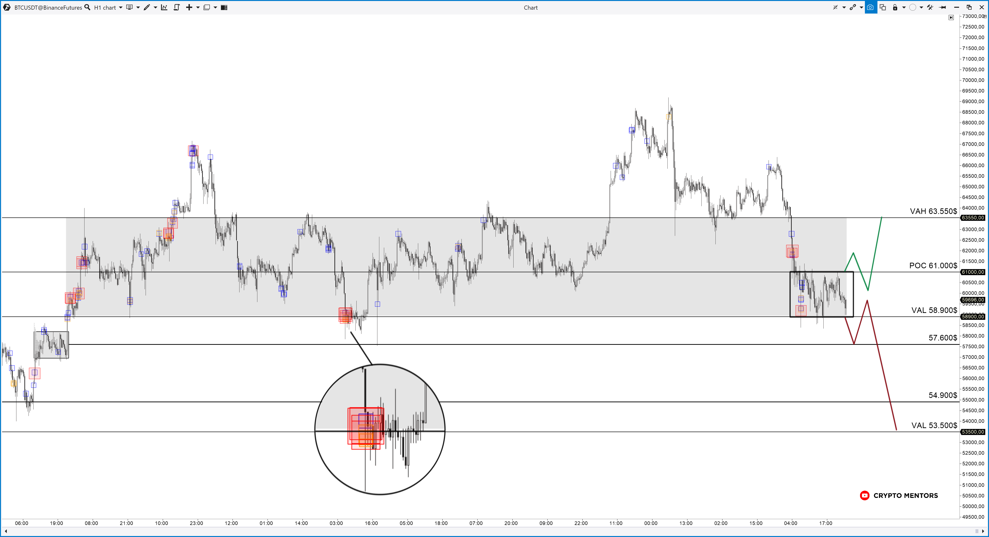 Цена первой криптовалюты на данный момент находится на уровне поддержки $58 900. Это граница объёмной зоны стоимости