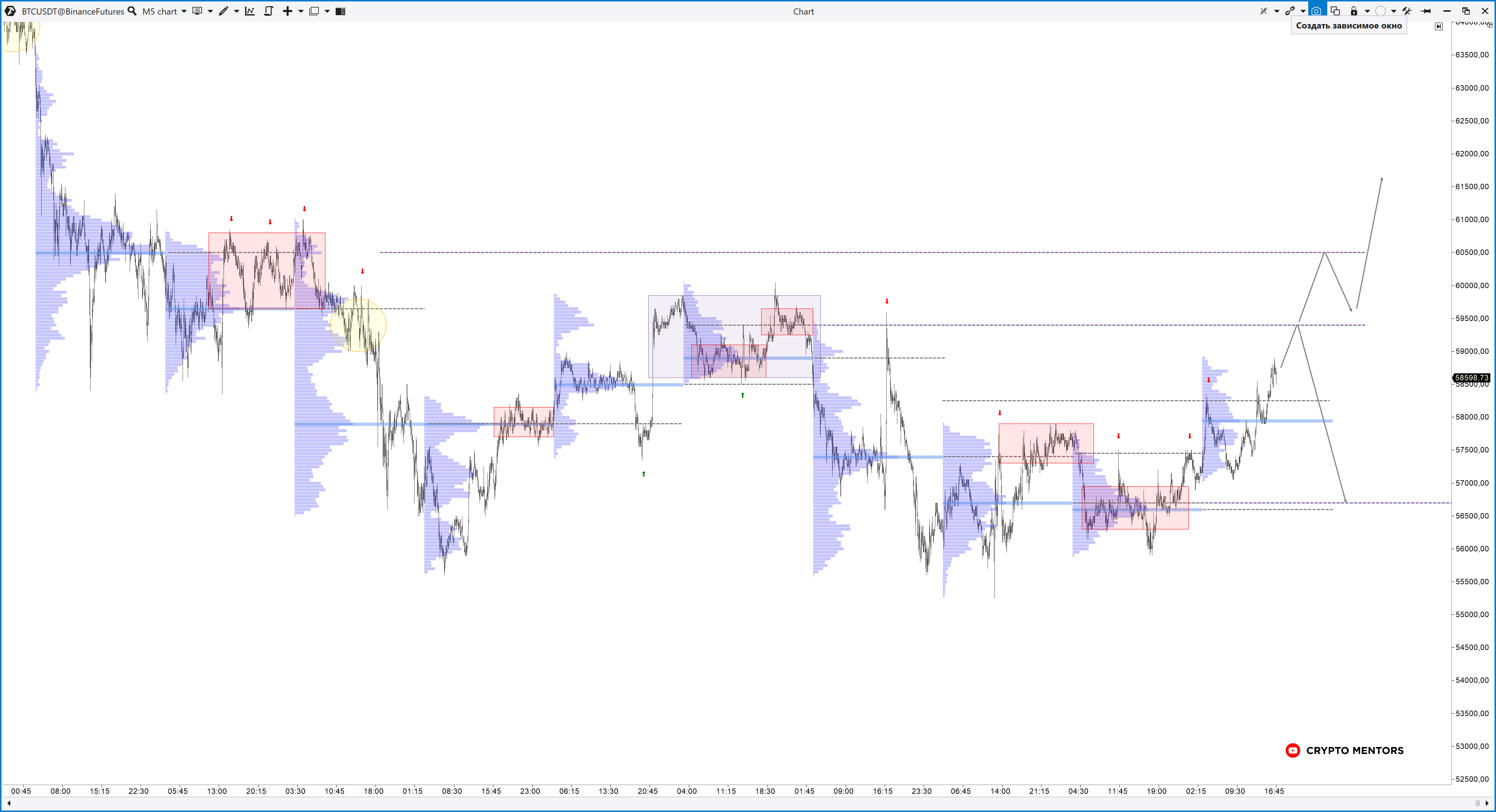 Первая криптовалюта дошла до зоны $59 500, войдя таким образом в рамки зоны справедливой стоимости из левой части: $59 500 - $53 500. Пока мы находимся в этом диапазоне ожидания строятся от движения в рамках этого коридора.