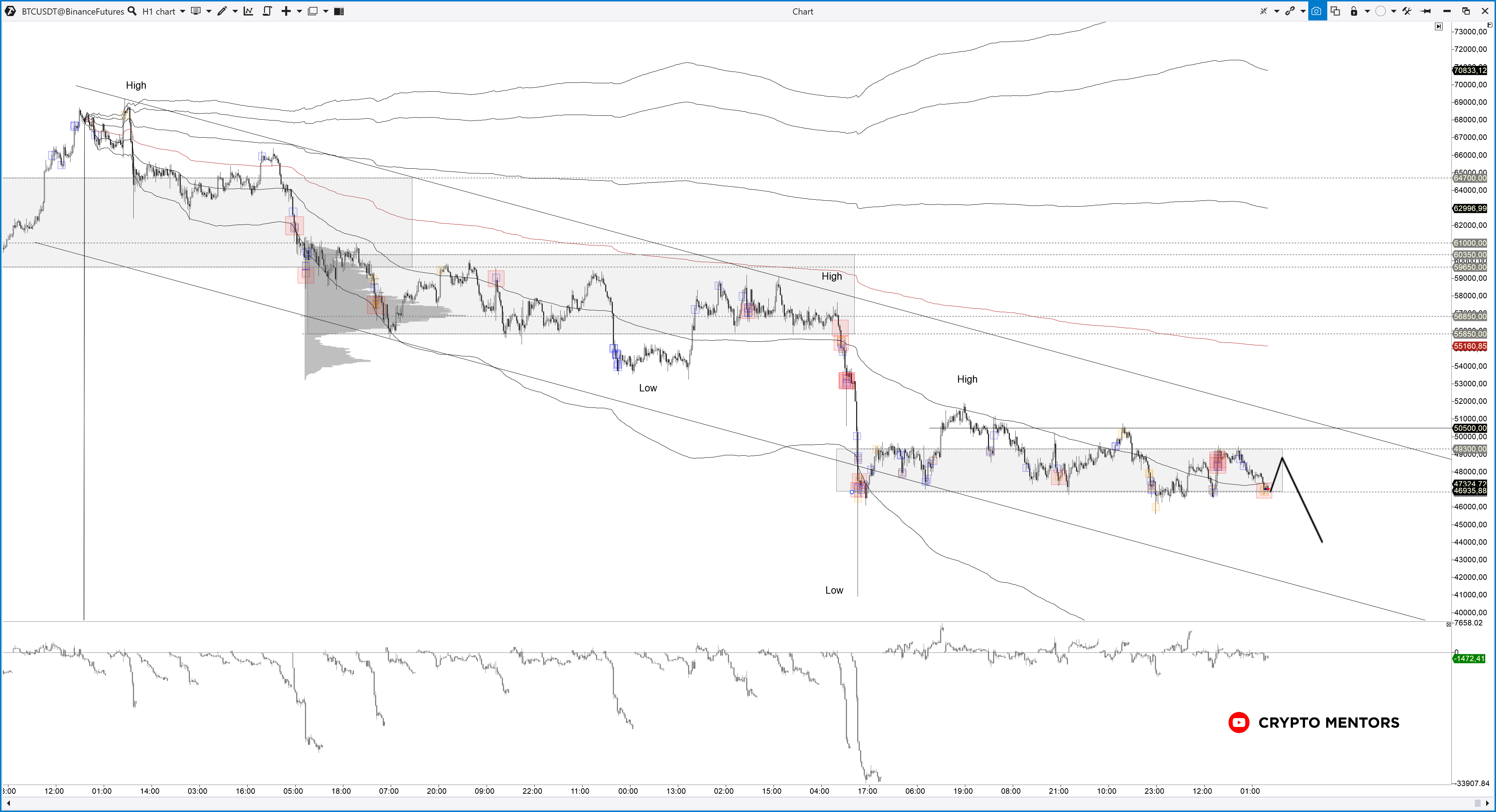 На данную секунду первая криптовалюта находится в объемном ядре с границами $49 300 - $47 000.