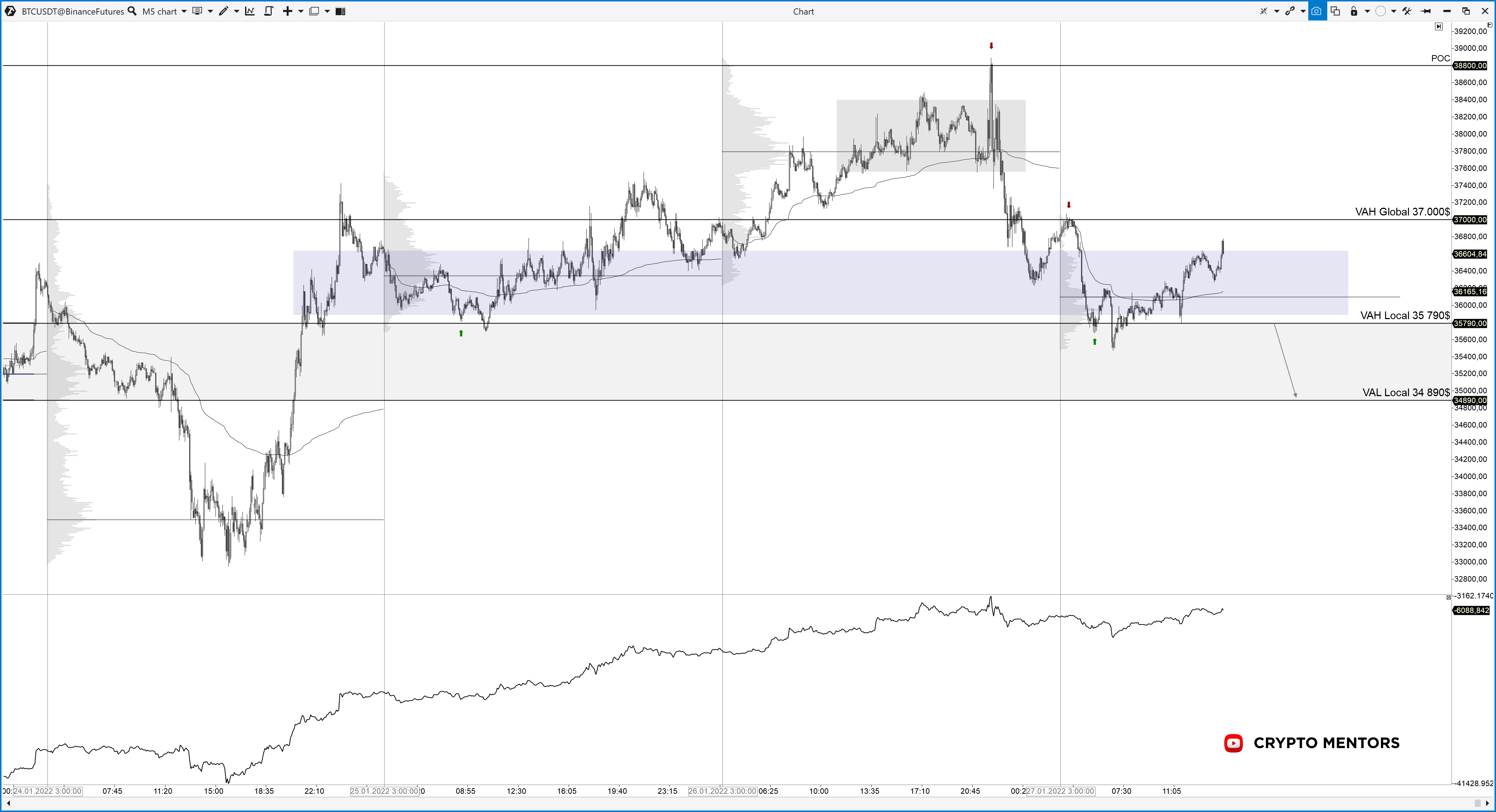 Более локально видим принятие в синей зоне стоимости с потенциалом хода к $35 790. При закреплении ниже открывается путь к $34 890. До этой отметки можно рассматривать шорт при появлении условий закрепления за уровнем и появления паттернов по OrderFlow.