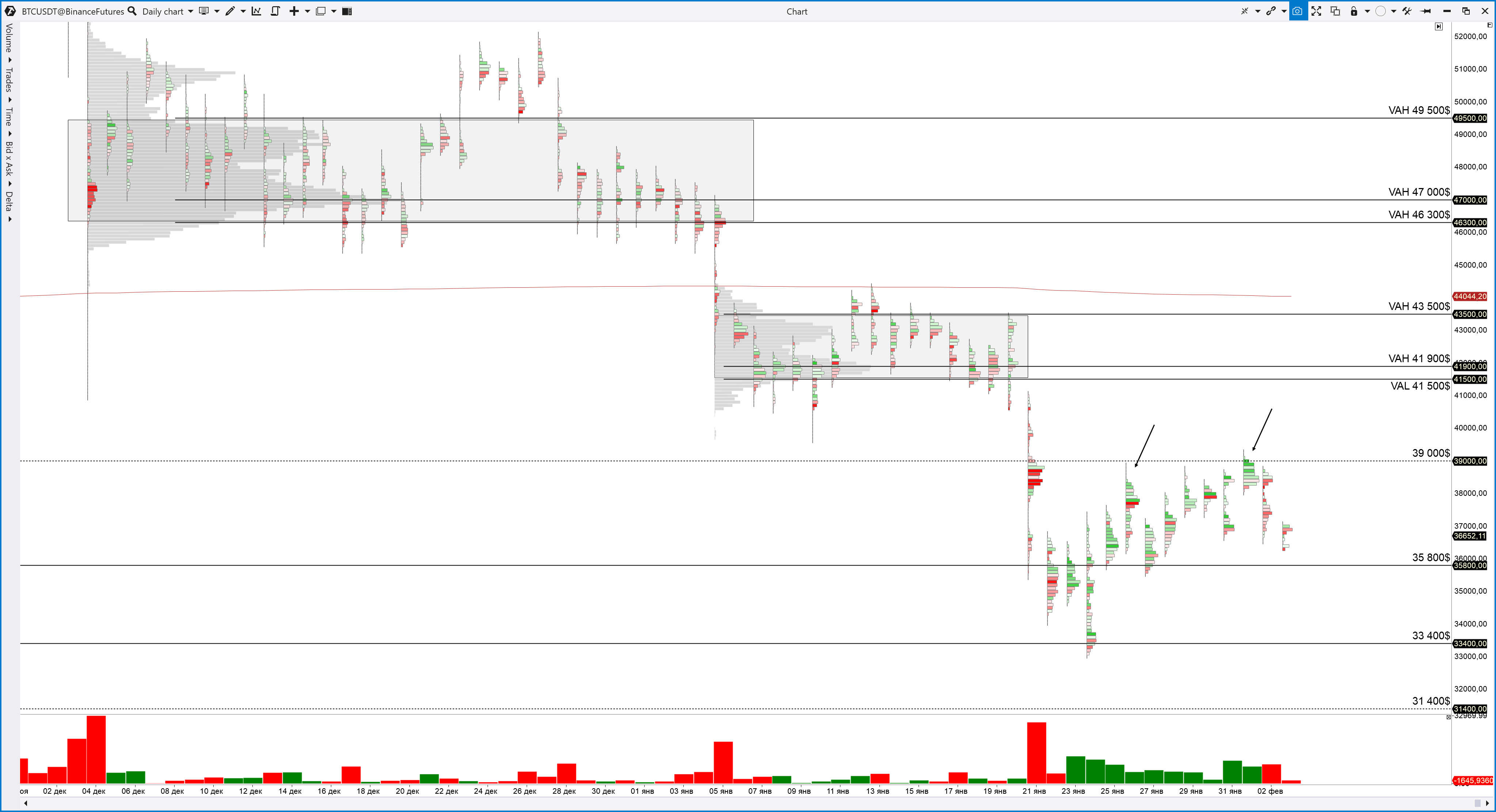 Как видно по дельте при попытке восходящего движения формируется контроль (зеленые гистограммы снизу), но при этом рост крайне слабый. На это указывает распределение покупок по самым хаям (отмечено стрелкой)