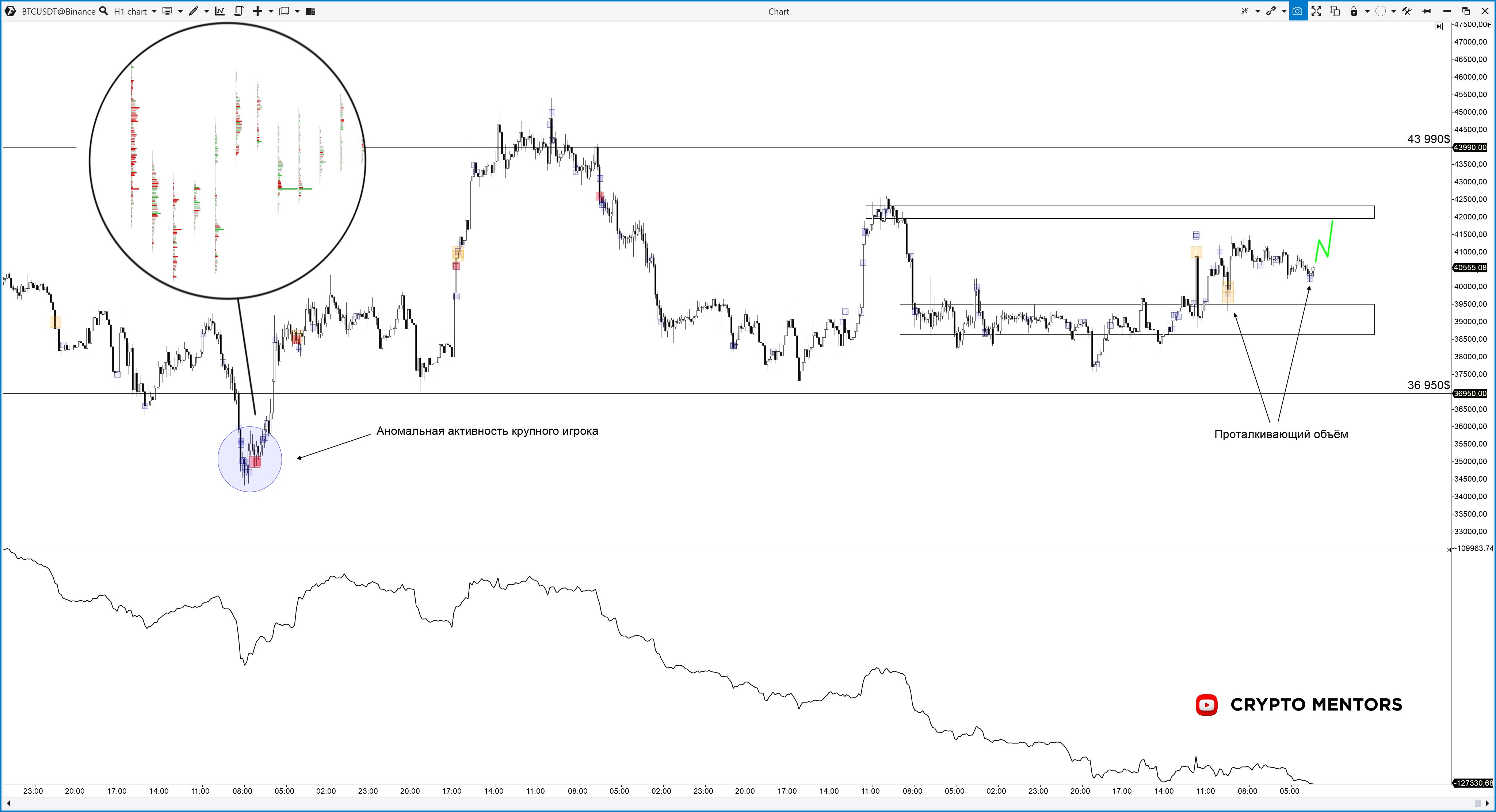 Обратите внимание на появление аномальных объемов снизу. Рыжие и синие квадраты – это действия крупного игрока, отображенные на графике из биржевой ленты. Судя по этим данным, указывающим на покупки, стоит ожидать отметку в $42 000 в ближайшее время.