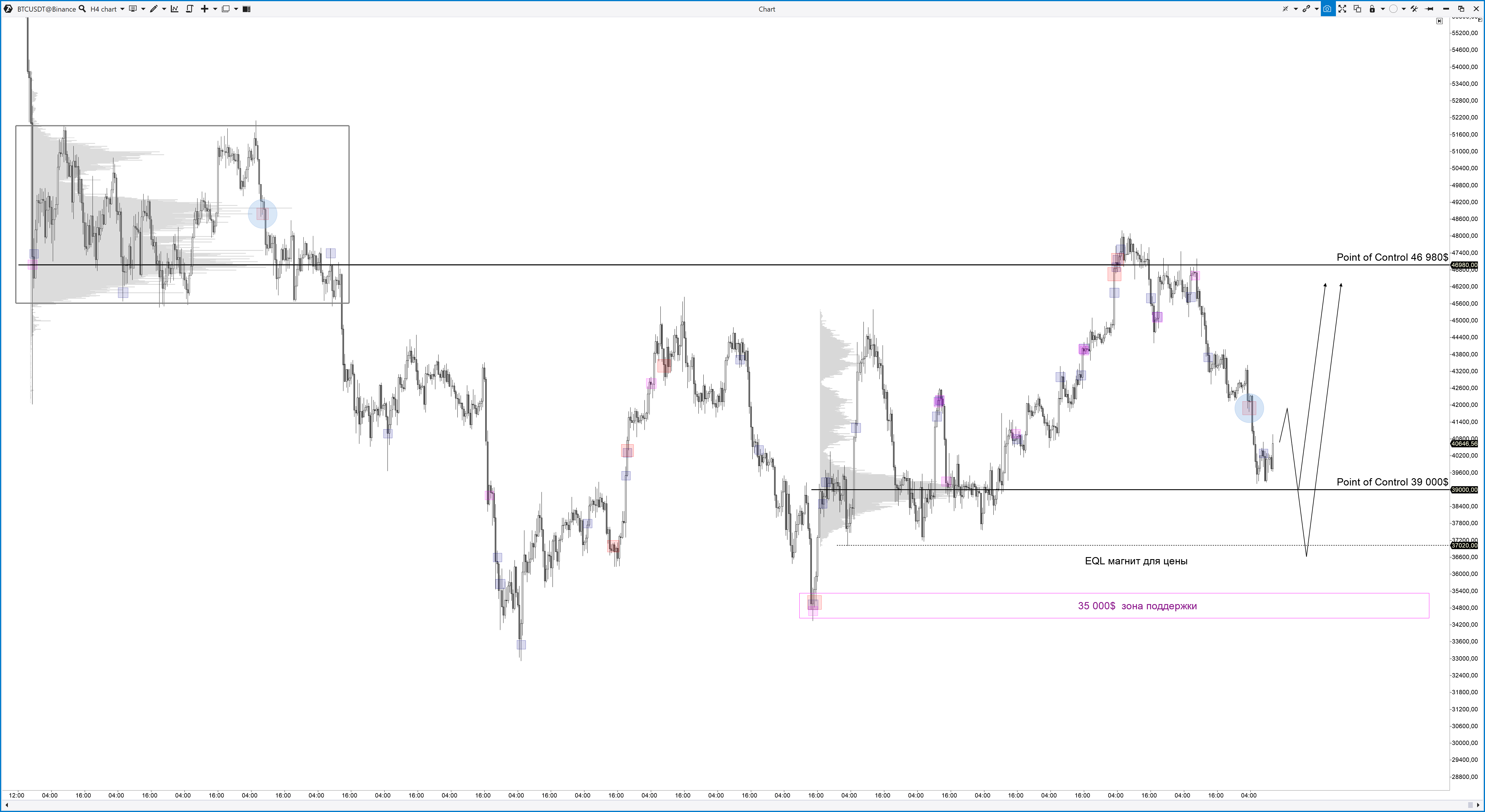 Биткоин подошел к крайне сильному уровню по горизонтальным объемам $39 000. По кумулятивной дельте видим, как все продажи активно начинают поглощаться лимитными покупками. Это работа крупного игрока, скупающего биткоин.