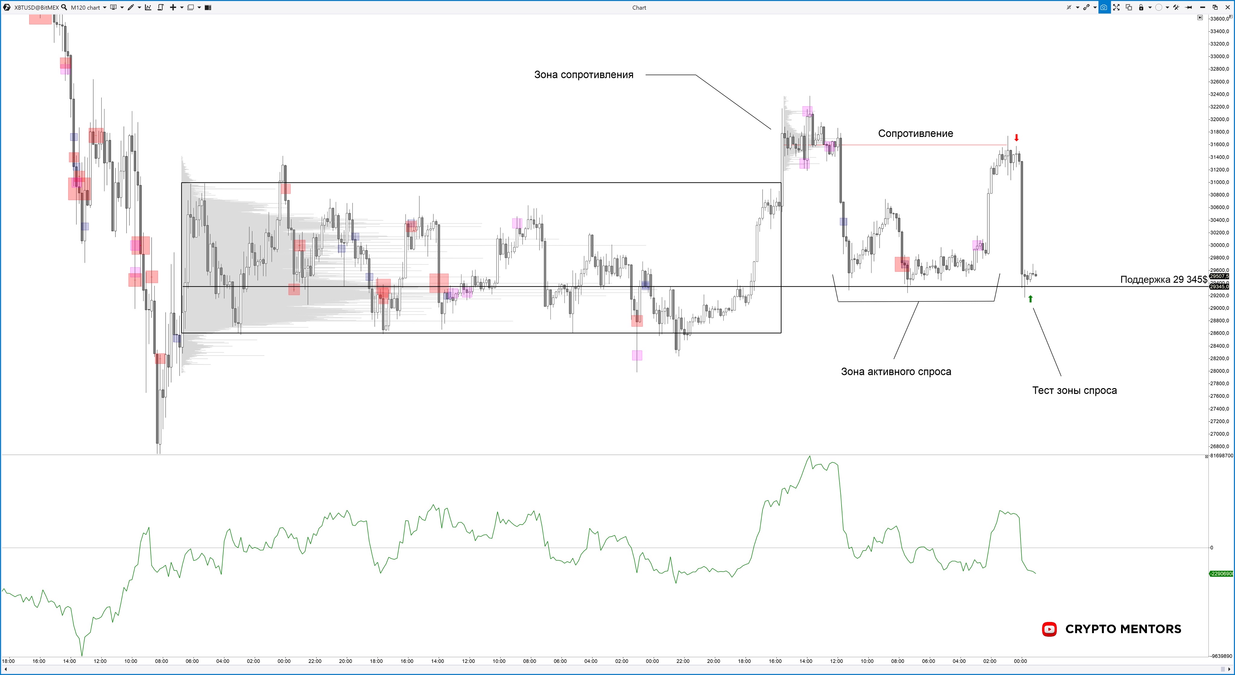 Лонг позиции являются более приоритетными. Осуществлять поиск сетапа на вход стоит в текущей области спроса (~$29 300). В обязательном порядке ставьте стоп-лосс.