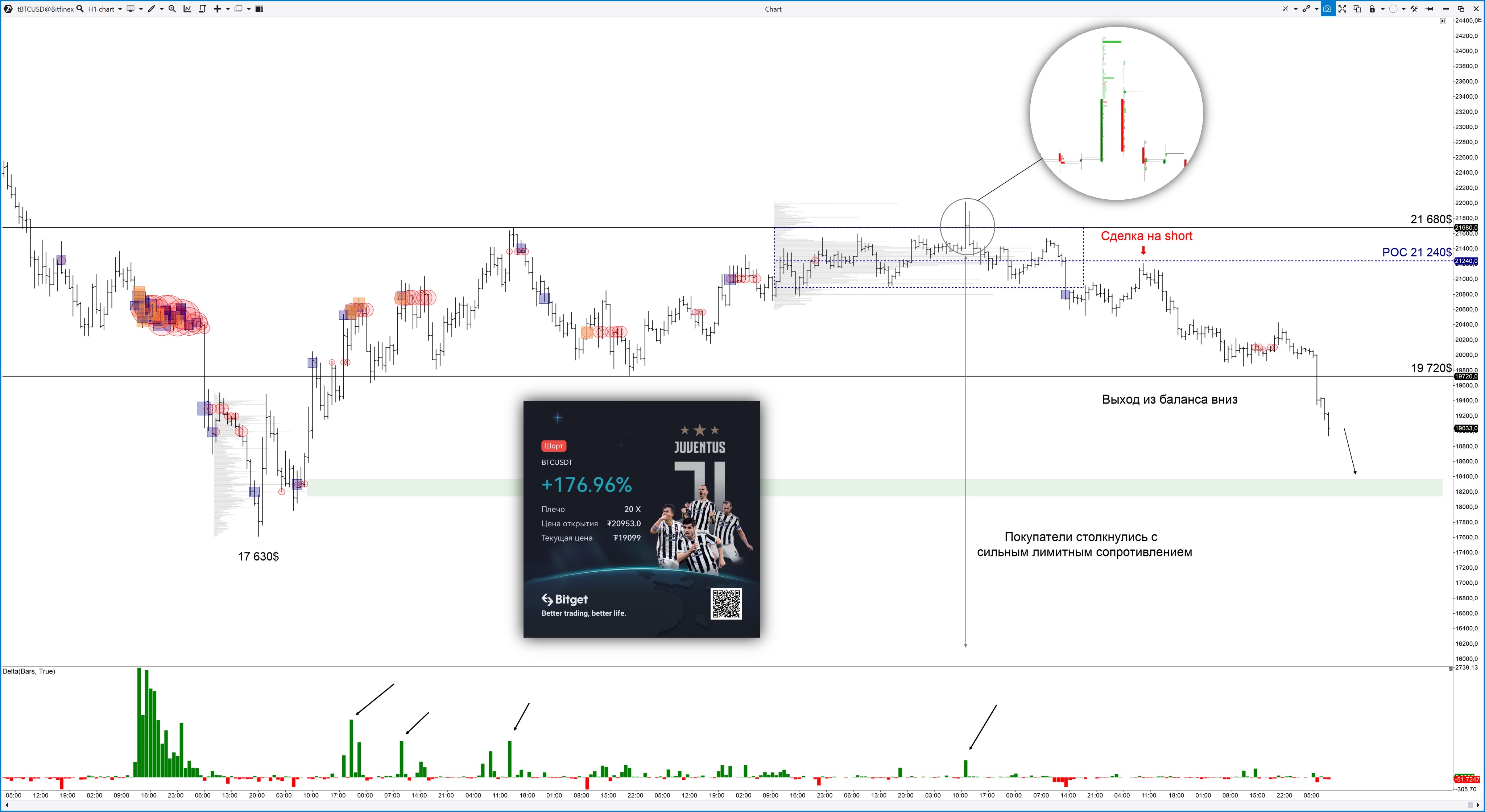 ▪️ При попытке закрепиться выше $21 680 котировка встретилась с сильной отзывчивой реакцией медведей, которые не пустили цену выше справедливой зоны стоимости.