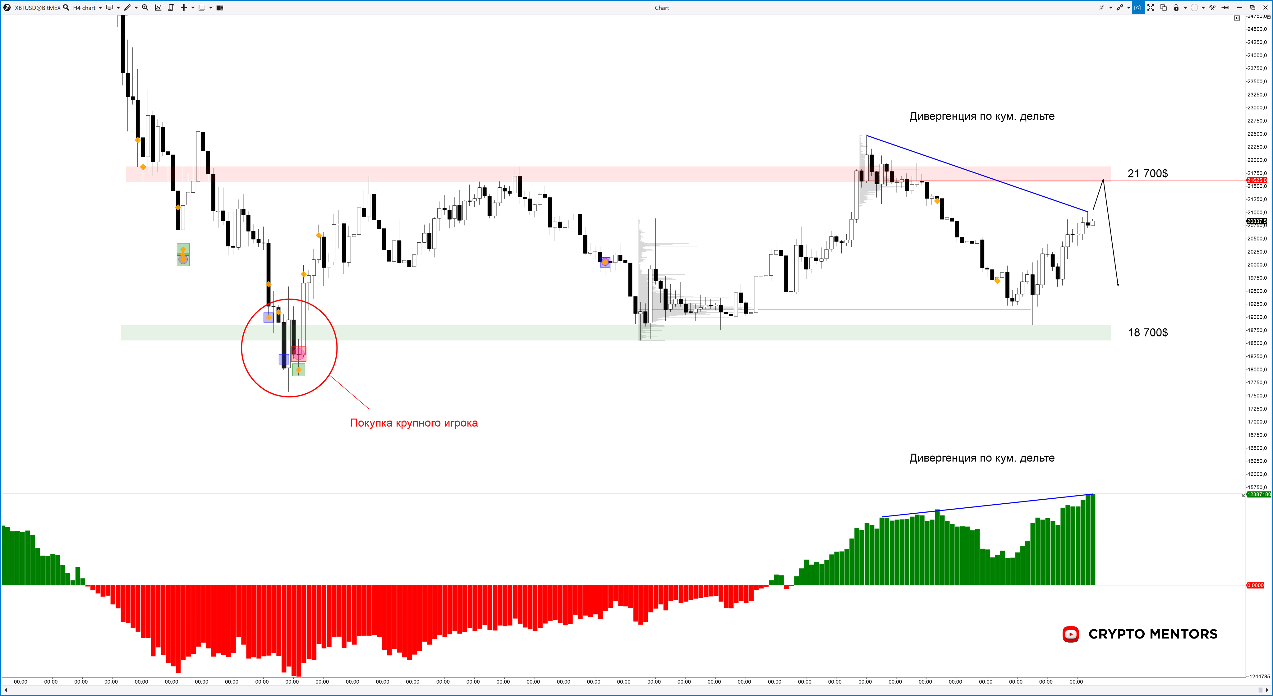 На данный момент таргетом для роста выступает уровень $21 700. Значительно выше уйти будет проблематично из-за дивергенции по кумулятивной дельте (столбики снизу). Этот инструмент показывает, что все рыночные покупки поглощаются крупными лимитными плитами, выставленными умными деньгами. То есть участники рынка с большими деньгами препятствуют росту биткоина.
