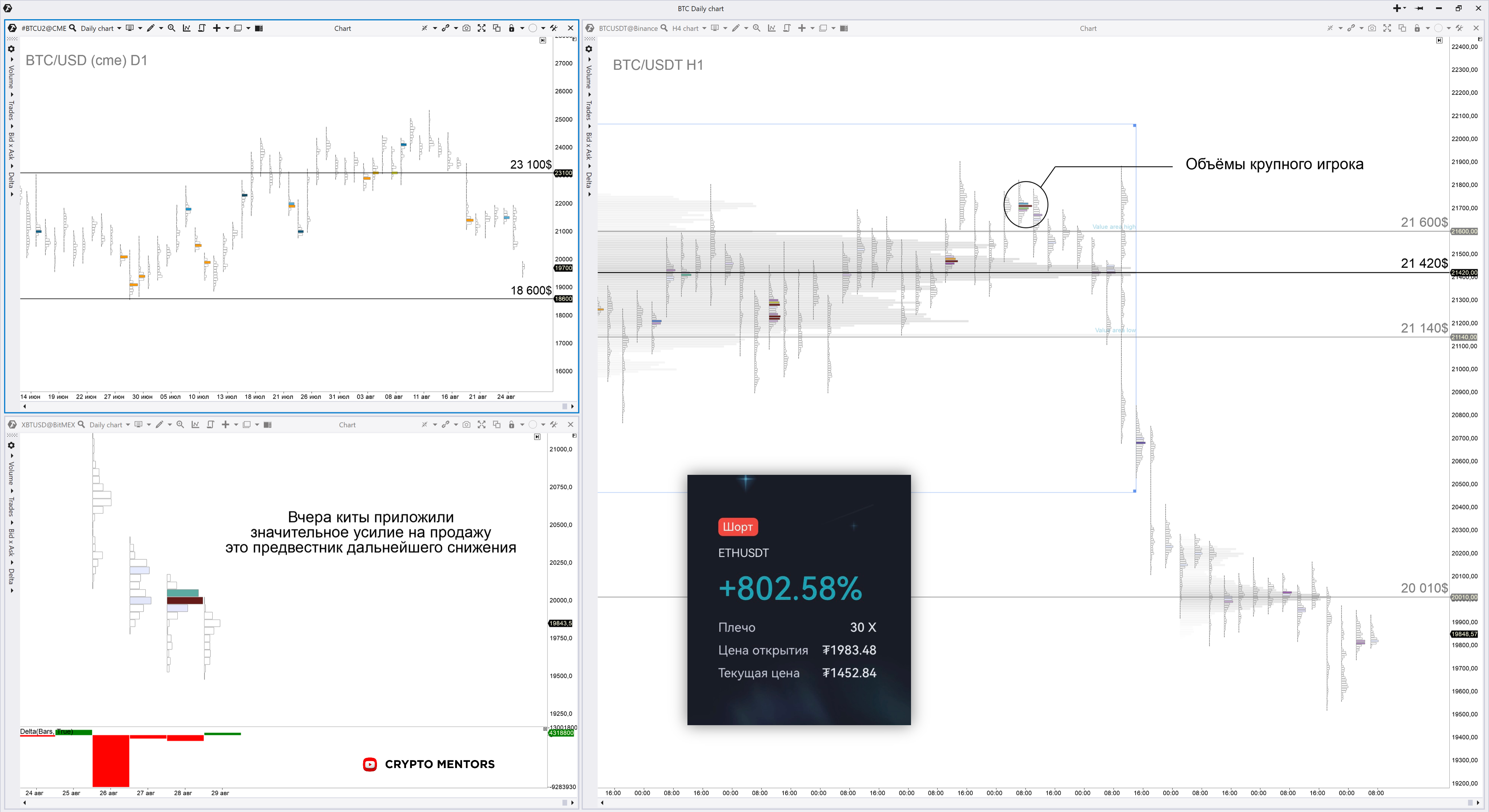 ▪️ Более локально (таймфрейм 1 час) заявки крупных игроков активно толкают цену ниже, поэтому ожидать рост выше уровня $21 600 в ближайшее время не стоит: там расположены огромные объемы китов на продажу. Ранее открытые шорт позиции резонно удерживать до обозначенного уровня.