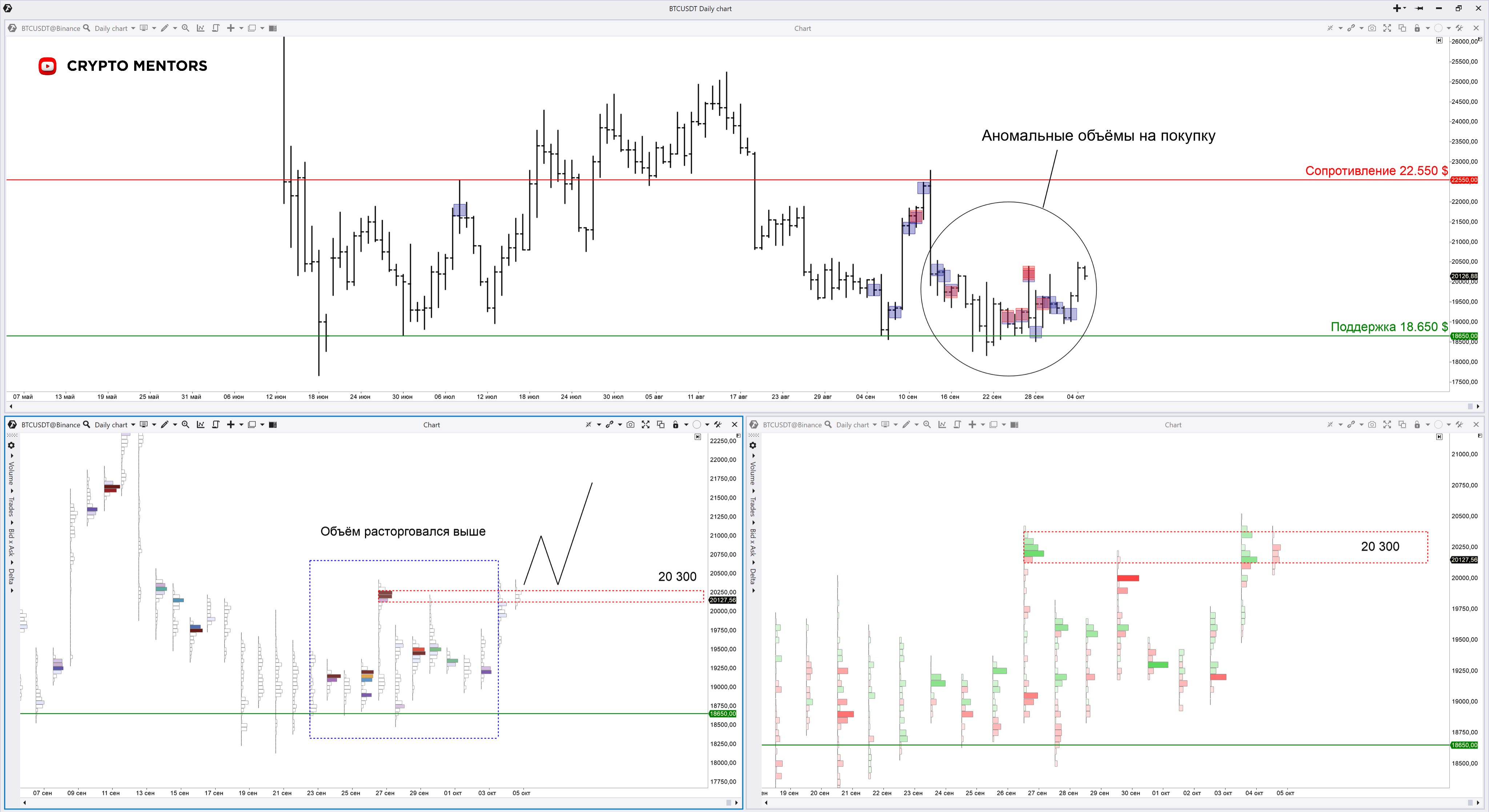 ▪️ Присоединяться к лонг позициям можно при пробое и закреплении выше $20 300. Именно на этих отметках 27 сентября последний раз проявлял себя аномально большой продавец. Важно отметить, что вход в сделку должен сопровождаться объемными подтверждениями и паттернами по OrderFlow на более тактических таймфреймах