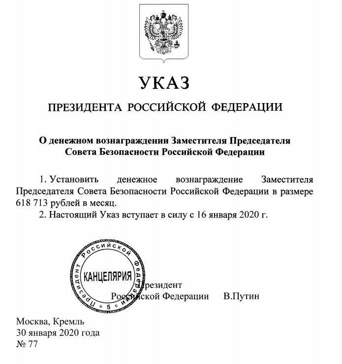 В финансовом плане для бывшего премьер-министра России Дмитрия Медведева за последние месяцы ничего не поменялось — получив должность зампредседателя Совбеза РФ, он согласно указу главы государства, сохранил свою зарплату в размере 618713 рублей. Такой оклад Медведеву назначил президент России Владимир Путин в прошлом году в свой день рождения.