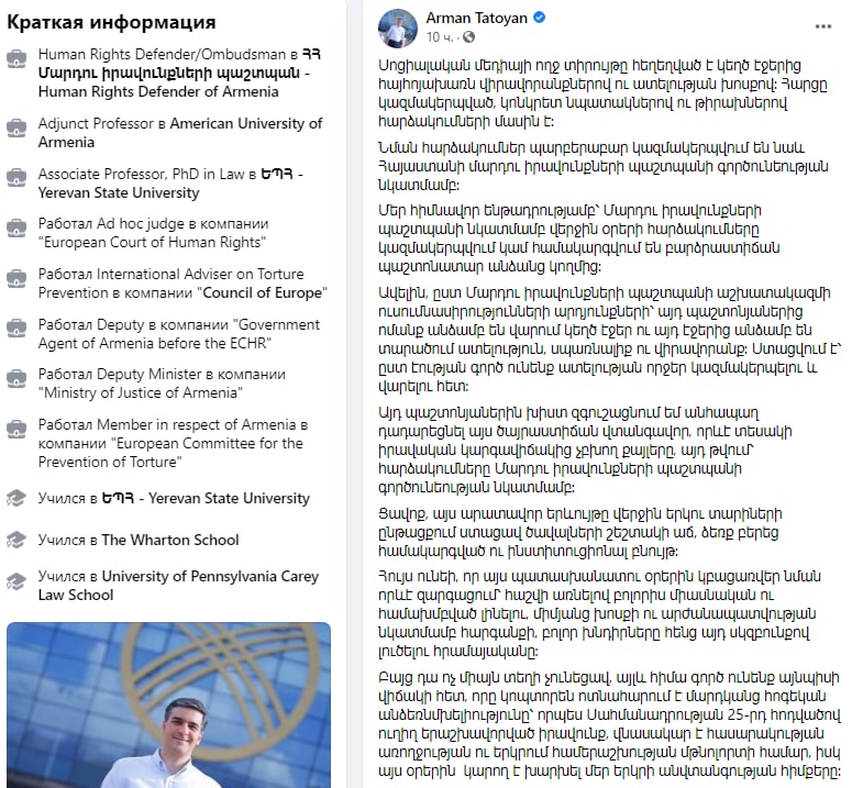 Омбудсмен Армении Арман Татоян в своем Facebook обвинил неназванных высокопоставленных чиновников в сознательной травле «тех, кто придерживается другого мнения»