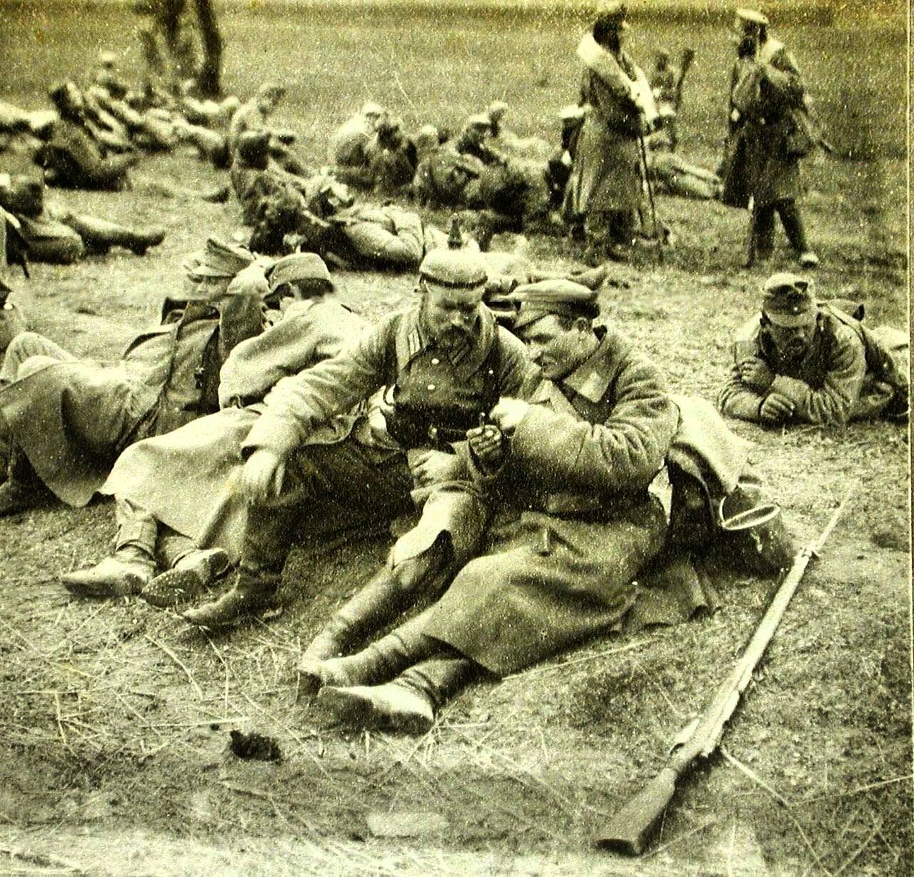 Немецкий военнопленный и русский воин о чем-то беседуют. А вокруг них австро-венгерские военнопленные.
