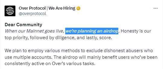 Не так давно Over Protocol сказали, что в ближайшем будущем планируют делать аирдроп.