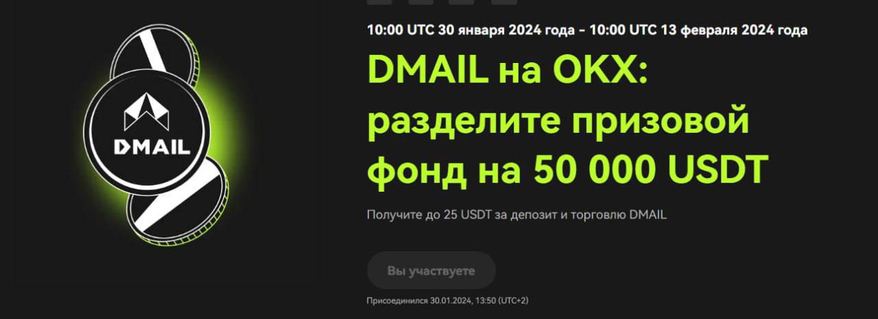 Всеми известная биржа OKX, запустила промку в честь листинга $DMAIL