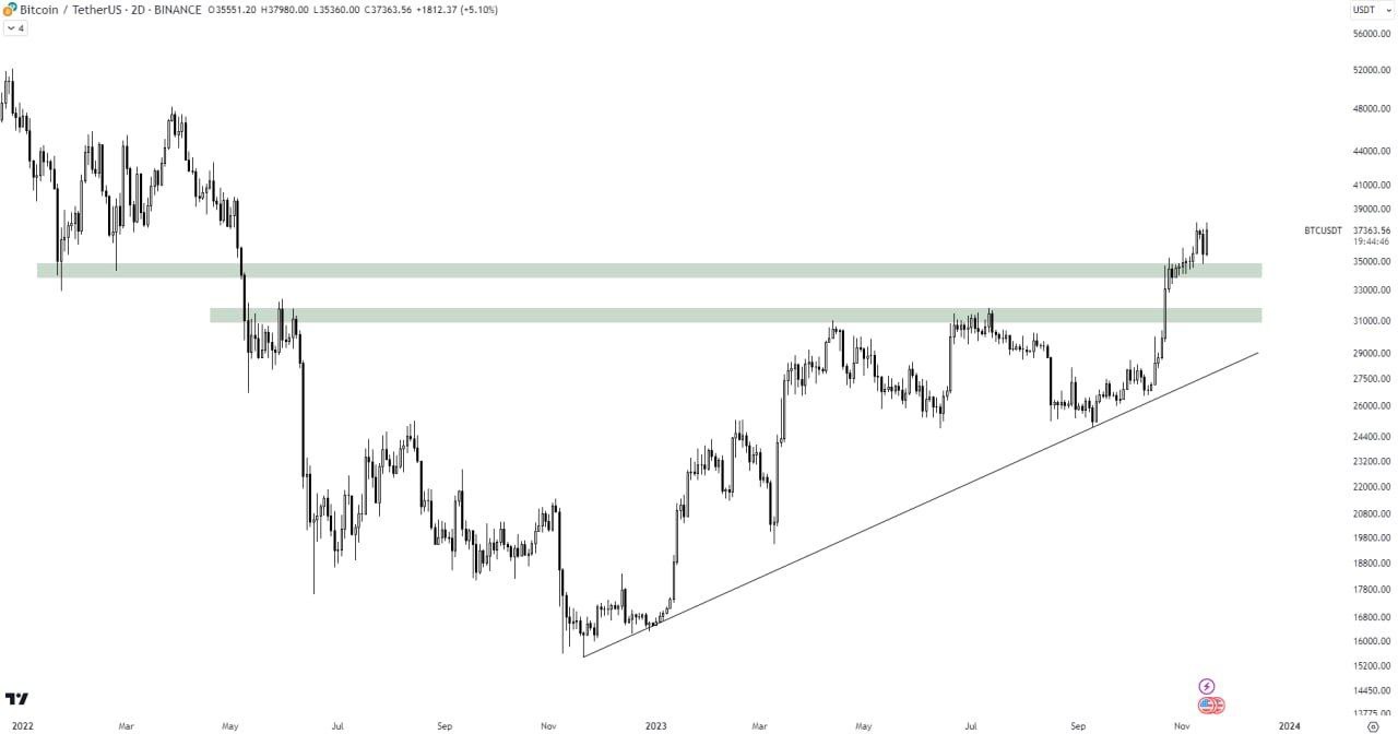 BTC has successfully bounced after retesting above the horizontal support with decent volume. Bulls need a solid candle close above $38K. As long as it continues trading above the horizontal support, we anticipate a continuation of the bullish trend.