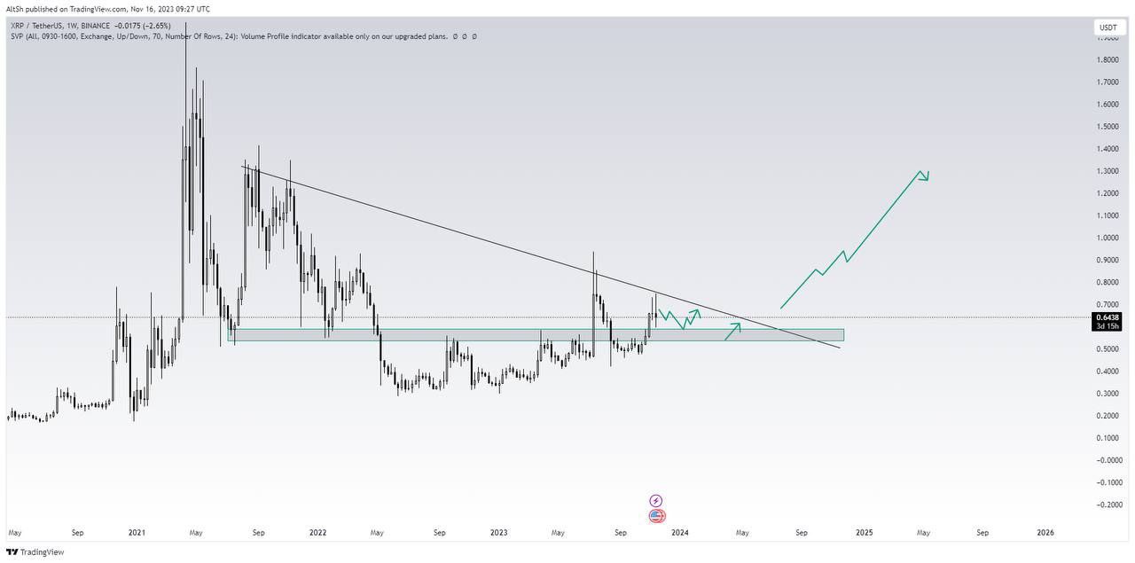 This is just the beginning of the actual mouvement. Right now we are only forming this downtrend, XRP will grab liquidity from the downside and then break from above, the two green lines on the horizontal rectangles are the entries. After that the breakout will happen hopefully, it will take us to over 100% - 200% profits unleveraged