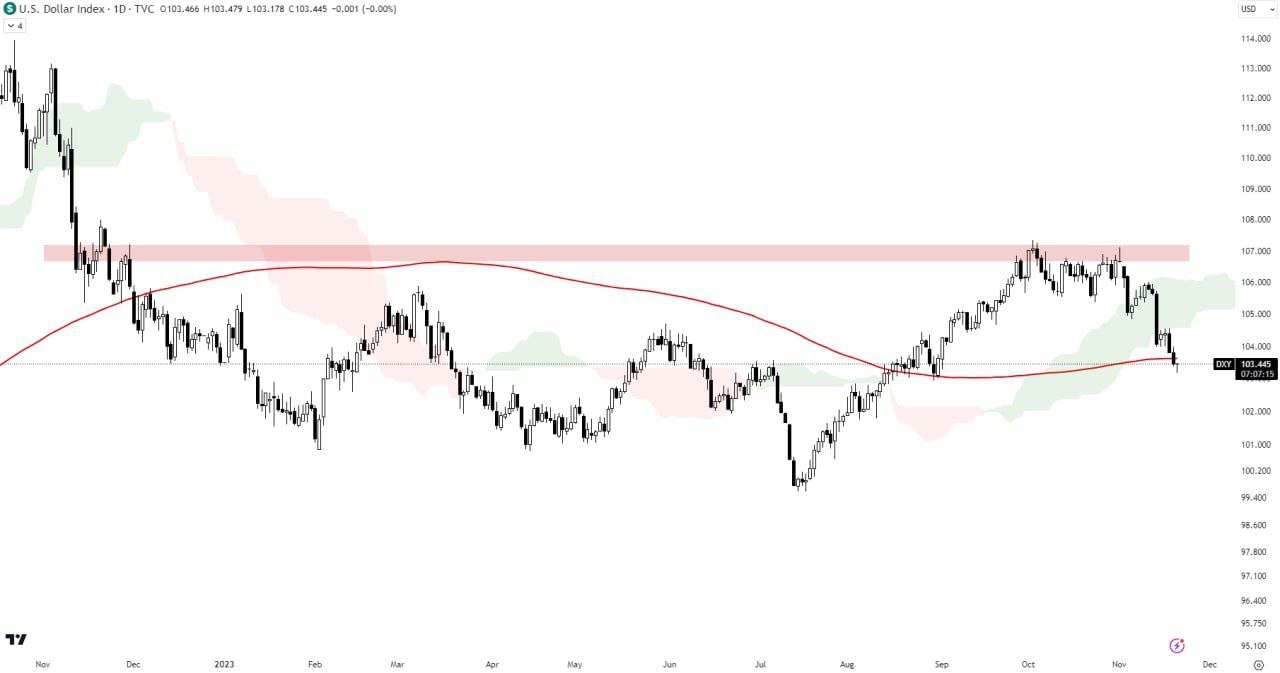 The US dollar has sustained its bearish trajectory following a rejection from horizontal resistance. Currently, it is also breaching the Ichimoku cloud and the MA 200, confirming its bearish trend.