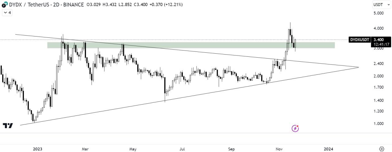 DYDX experienced a notable increase in volume following the breakout from the symmetrical triangle. Presently, it is in the process of reclaiming the horizontal support. A confirmation of the bullish momentum would be achieved with a strong candle close above this level.