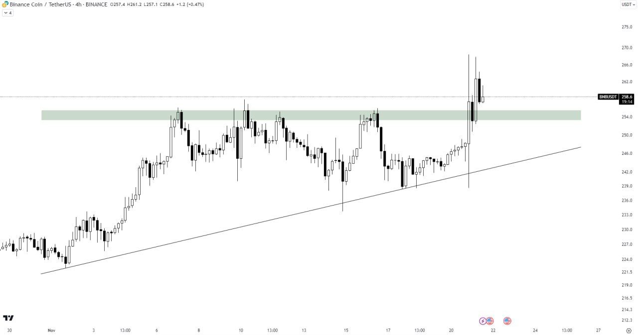 BNB has broken out of the ascending triangle with a significant increase in volume. Presently, it is undergoing a retest above the triangle.