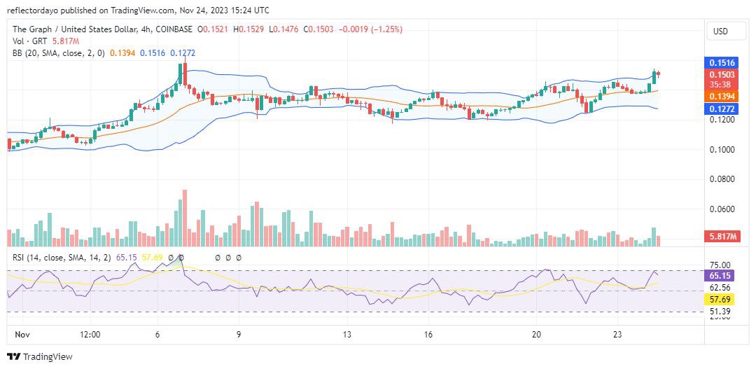In the latter half of October, The Graph entered a noteworthy bullish phase, consistent with broader trends in the cryptocurrency market. Following a period of approximately two and a half months characterized by sideways movement around the $0.08 price level, a protracted struggle between bulls and bears ensued. The turning point came on October 20, when bulls initiated an upward drive. However, the bullish momentum encountered resistance at the $0.16 price level on November 7.
