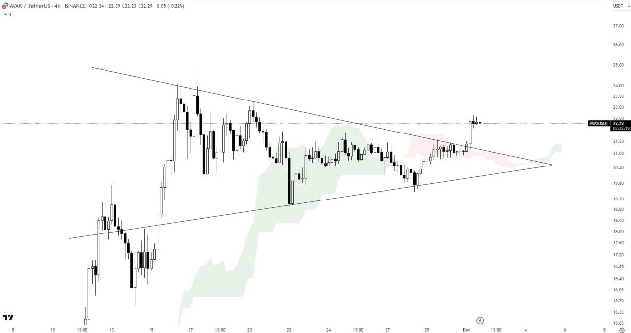 AVAX has broken out of the symmetrical triangle with significant volume. Additionally, it has surpassed the Ichimoku cloud. A continuation of the bullish trend is anticipated at this point or following a successful retest of the triangle.