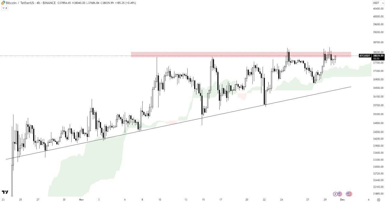 BTC has closed with a bullish Monthly candle, signaling a healthy market trend. It is currently making attempts to successfully break out of the horizontal resistance while trading above the Ichimoku cloud. Monitoring for a solid breakout of the horizontal resistance is crucial for confirming a strong bullish trend.
