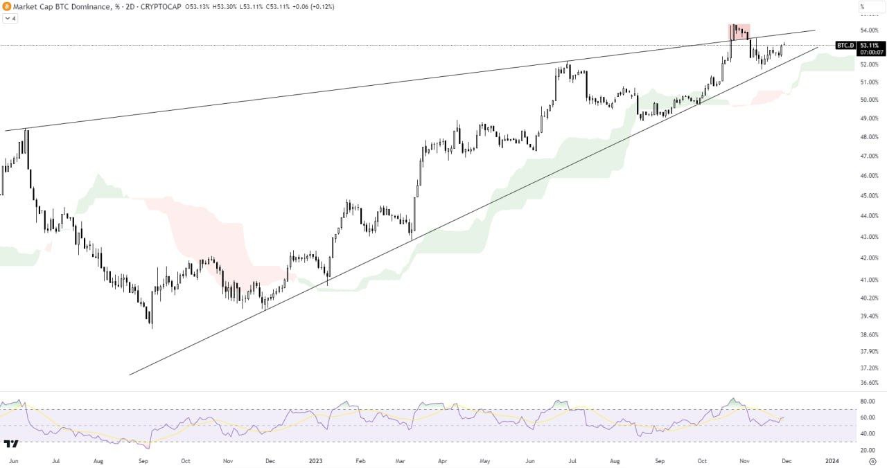BTC.D appears to be forming a rising wedge, which is typically considered a bearish pattern. The RSI is trending towards the oversold region. Notably, the Ichimoku cloud is currently providing support.