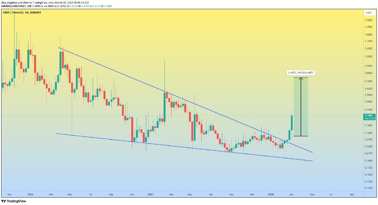 Were back with a new trading opportunity: DREPs Weekly Timeframe shows an Ascending Triangle Breakout! Our analysis predicts a 300% Bullish Wave 📈 Dont miss out.
