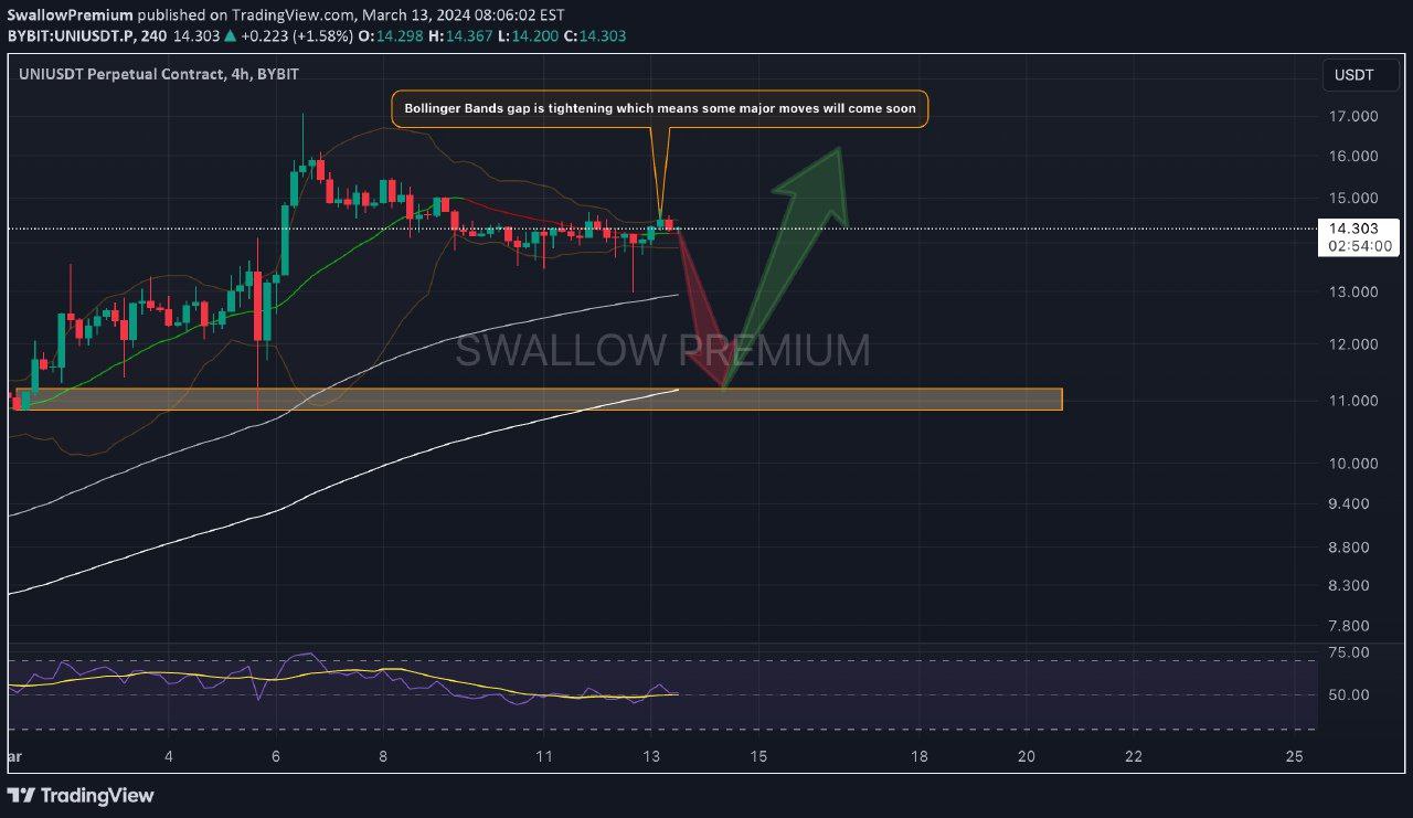 Our team sees potential for Uniswap coin to make significant gains as it approaches the 100 and 200 EMAs. While currently experiencing a minor decline, Bollinger Bands indicate a potential strong movement ahead.