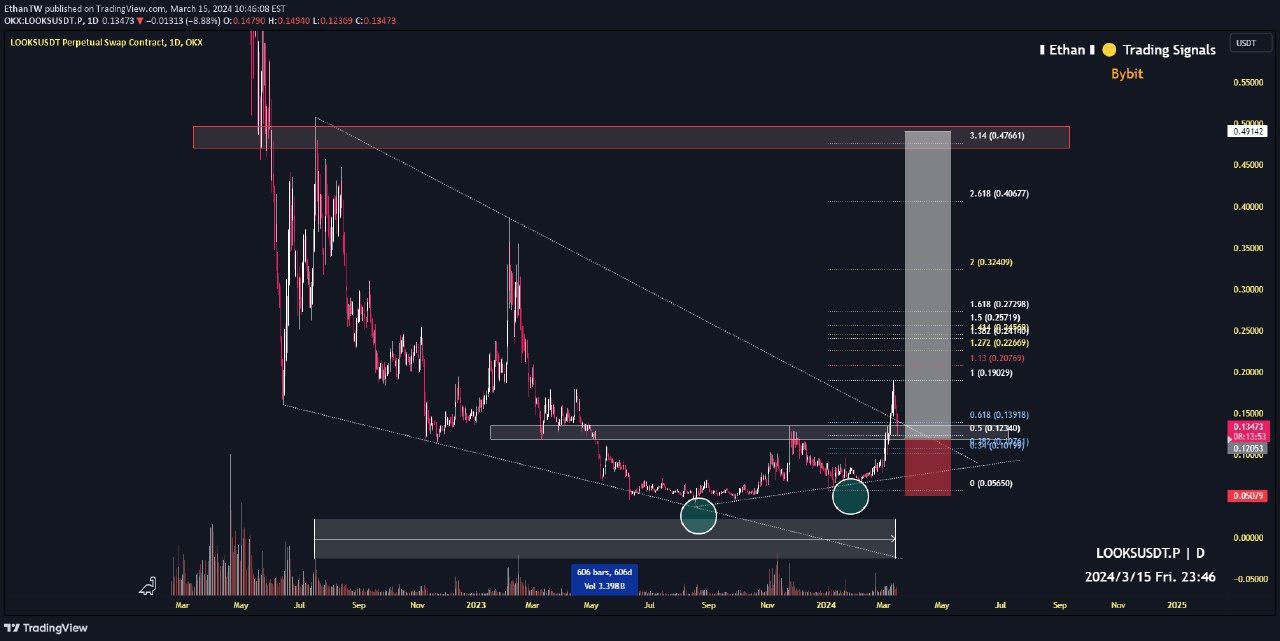 0.5 is the target for a 1D time frame on LOOKS as it retraces a massive falling structure over 600 days. This breakout signifies strength and a trade setup, with TP at 0.476 and SL at 0.05. Set your plan while retesting the solid support zone.