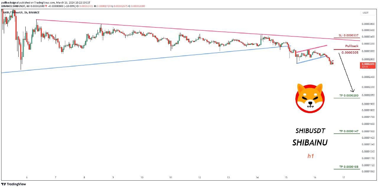 Trading Setup: Sell signal for SHIBUSDT SHIBAINU (1h) (Futures) is active. Open Sell Trades now or at 0.0000305 - SL at 0.0000337. TP1 at 0.0000200, TP2 at 0.0000147, TP3 at 0.0000108. Our analysis supports this decision.