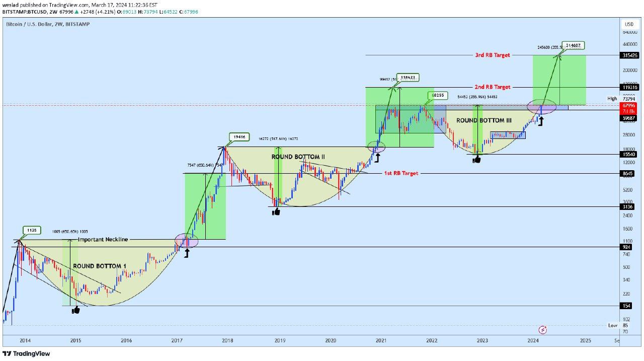 Over the years, weve observed a trend of BTC forming a rounding bottom pattern before each bull run. This year, were seeing similar movements and a critical support level at 59k, backed by historical data. Get ready for significant BTC movements.