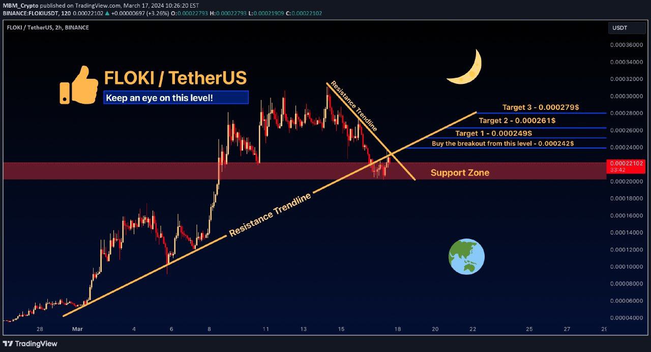Keep a close eye on FLOKI as it prepares for a big move! Our team suggests buying above 0.000242$ and taking profits at 0.000249$, 0.000261$, and 0. Aim for successful trading with this setup.