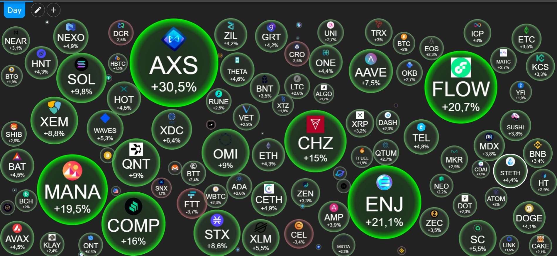 Если прошлую неделю росли DeFi-проекты, то в эту — NFT. А возглавляет их игра Axie Infinity с токеном AXS, которая за неделю выросла в 2 раза, а за 3 недели - в 9 раз!