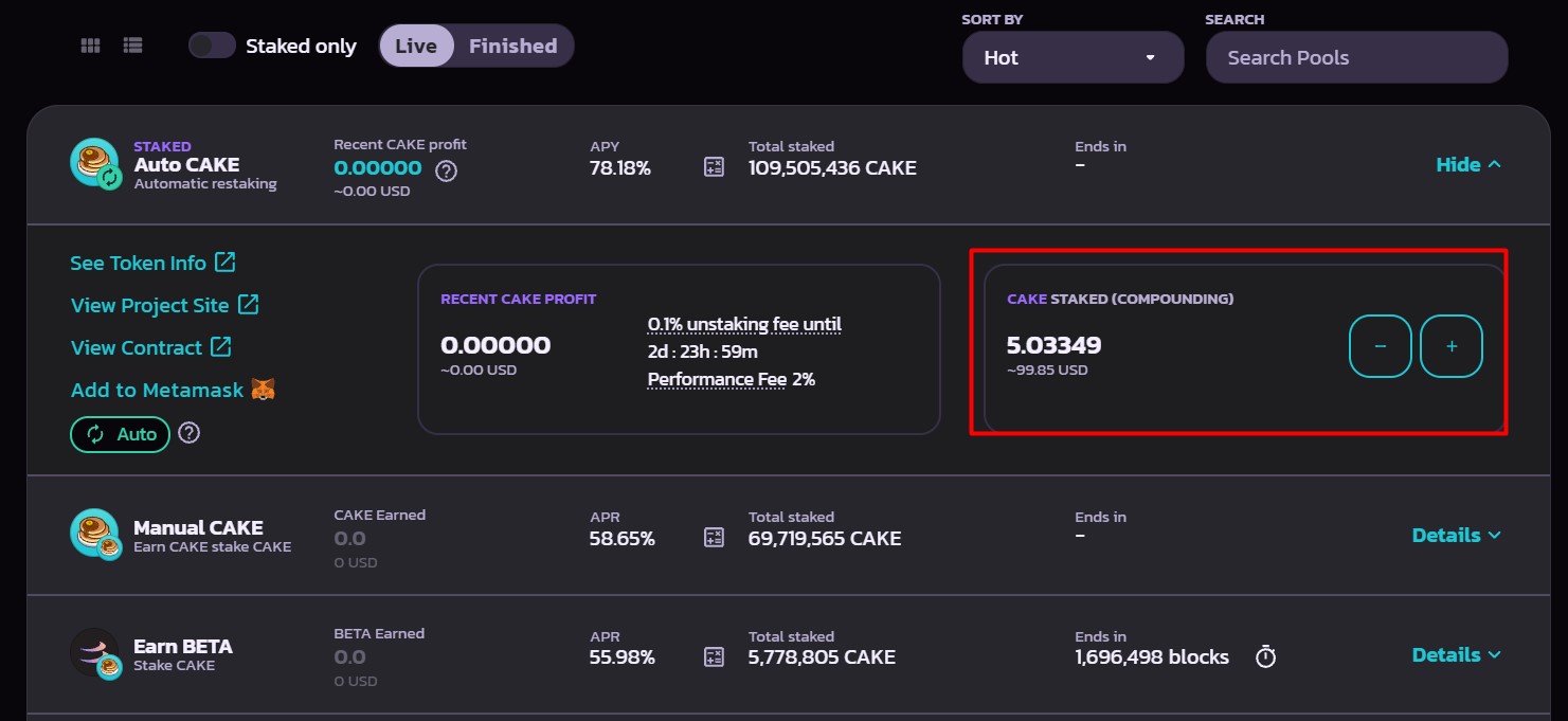Сразу же положили CAKE в пул ликвидности под 78% годовых. Все заработанные CAKE будут автоматически реинвестироваться каждые 72 часа на баланс пула. Благодаря сложному % доходность выше, чем в обычном пуле.