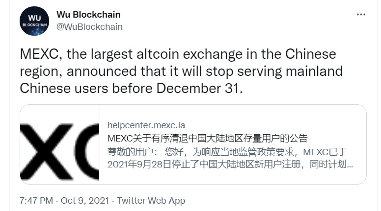 ❌ Биржа MEXC прекращает работу на материковом Китае вслед за остальными биржами