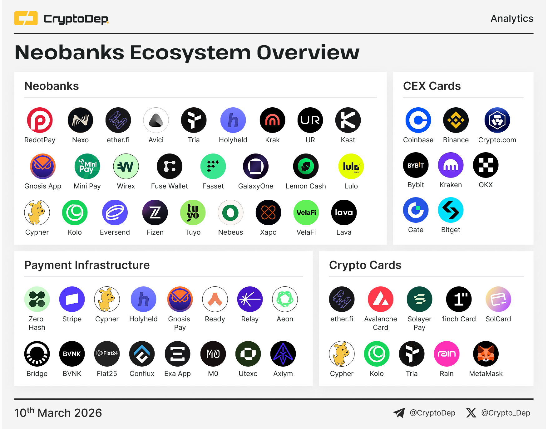 The expansion of on-chain payments and stablecoins is driving the rise of a new ecosystem, with projects building across neobanks, payment infrastructure, and crypto card services.