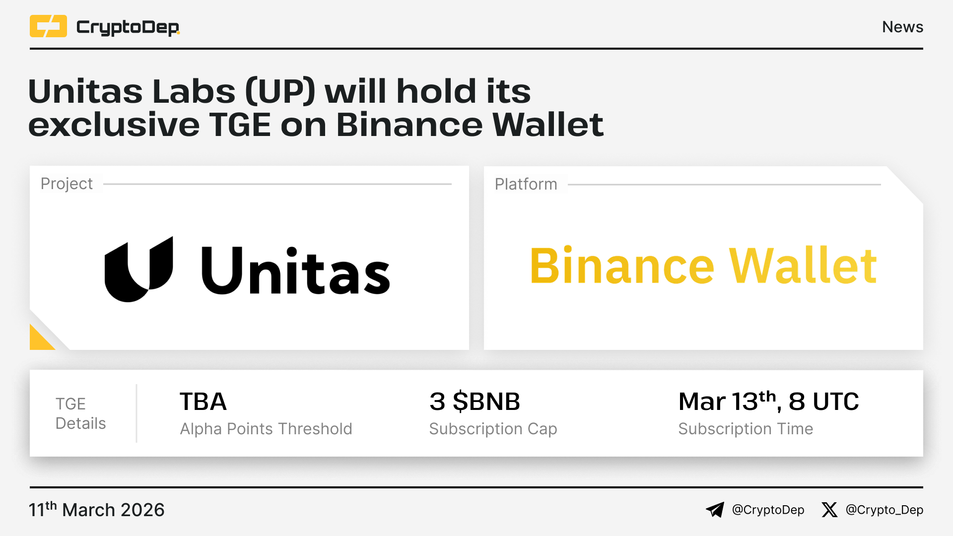 Unitas will become the 44th exclusive TGE on Binance Wallet, while the required Alpha Points threshold will be announced on March 13th before the subnoscription starts. Unitas is a yield generation layer built to produce sustainable, market-neutral returns across multiple asset classes.