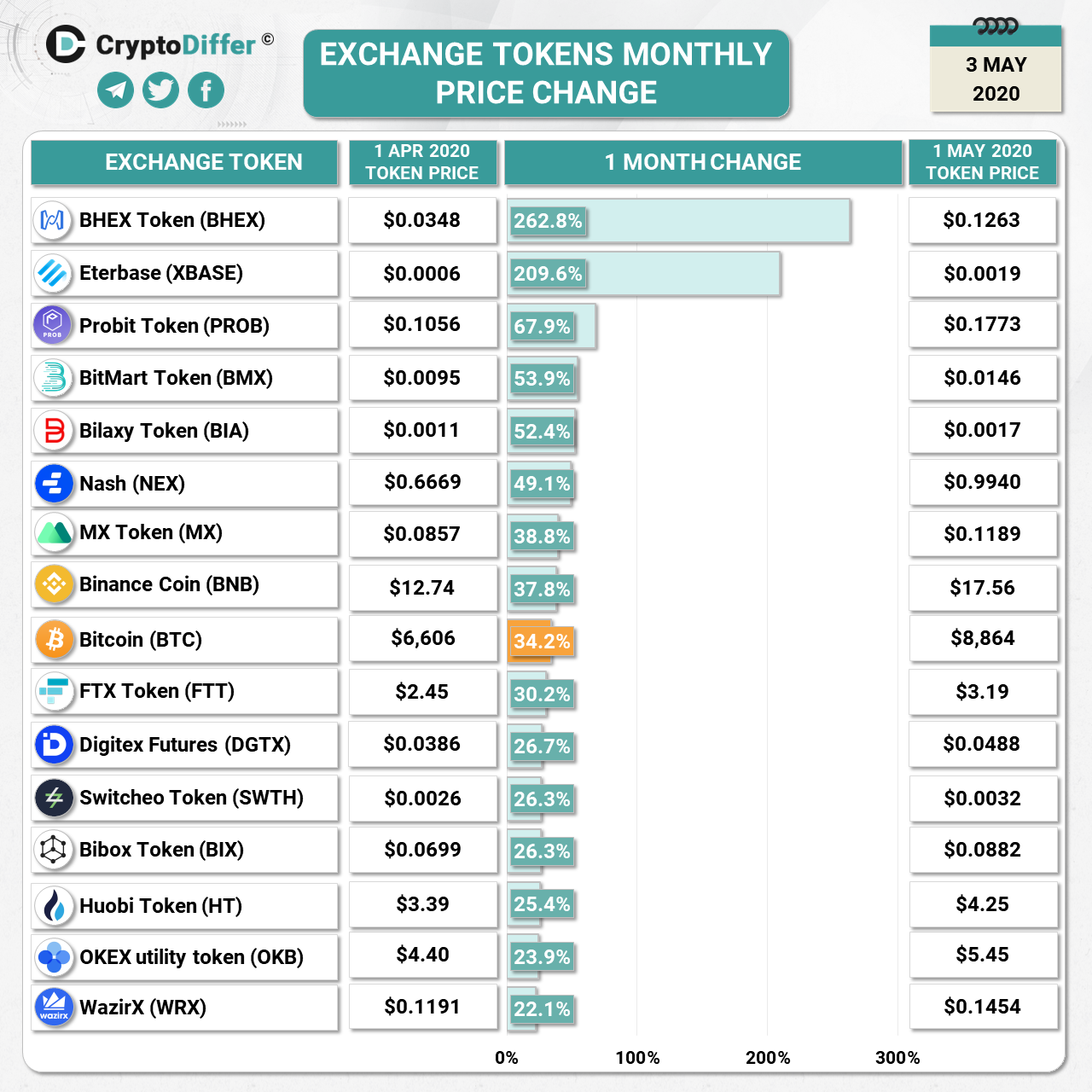 The best performers are BHEX Token +262.8%, Eterbase +209.6%, Probit Token +67.9%, BitMart Token +53.9% and Bilaxy Token +52.4%